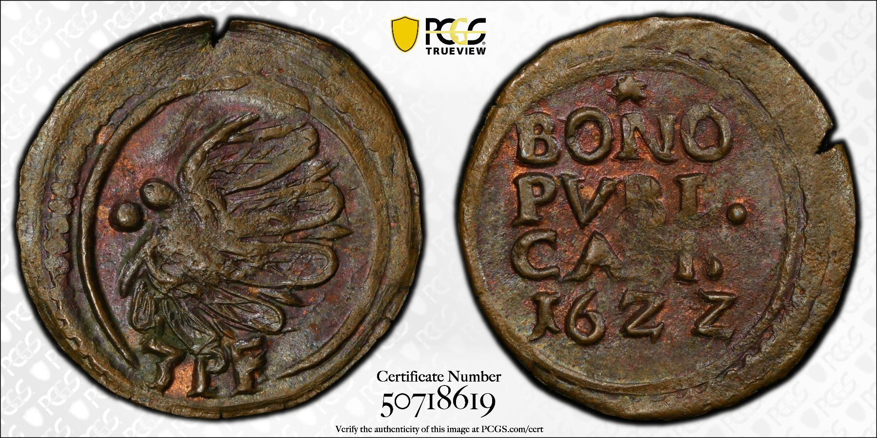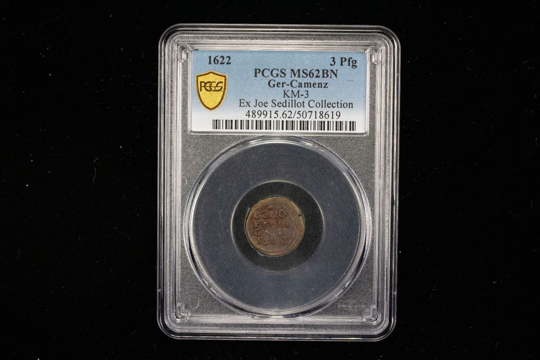 CAMENZ: Free Imperial City, AE 3 pfennig, 1622, KM-3, a pleasing lustrous chocolate brown mint state example, PCGS graded MS62 BN, ex Joe Sedillot Collection. The town of Camenz (Kamenz) is known as the birthplace of the philosopher and poet Gotthold Ephraim Lessing and Bruno Hauptmann. Kamenz citizens officially turned Protestant in 1536. In the Schmalkaldic War of 1546/47, the Upper Lusatian towns refused to support the troops of the Habsburg emperor Ferdinand I against the Protestant princes and were penalised with the loss of numerous privileges. The Franciscan convent finally dissolved in 1564. With the 1635 Peace of Prague, the Lusatias passed from the Bohemian Crown to the Electorate of Saxony. Several witch-hunts are documented in the 17th century. In 1707 a fire destroyed large parts of the old town.
