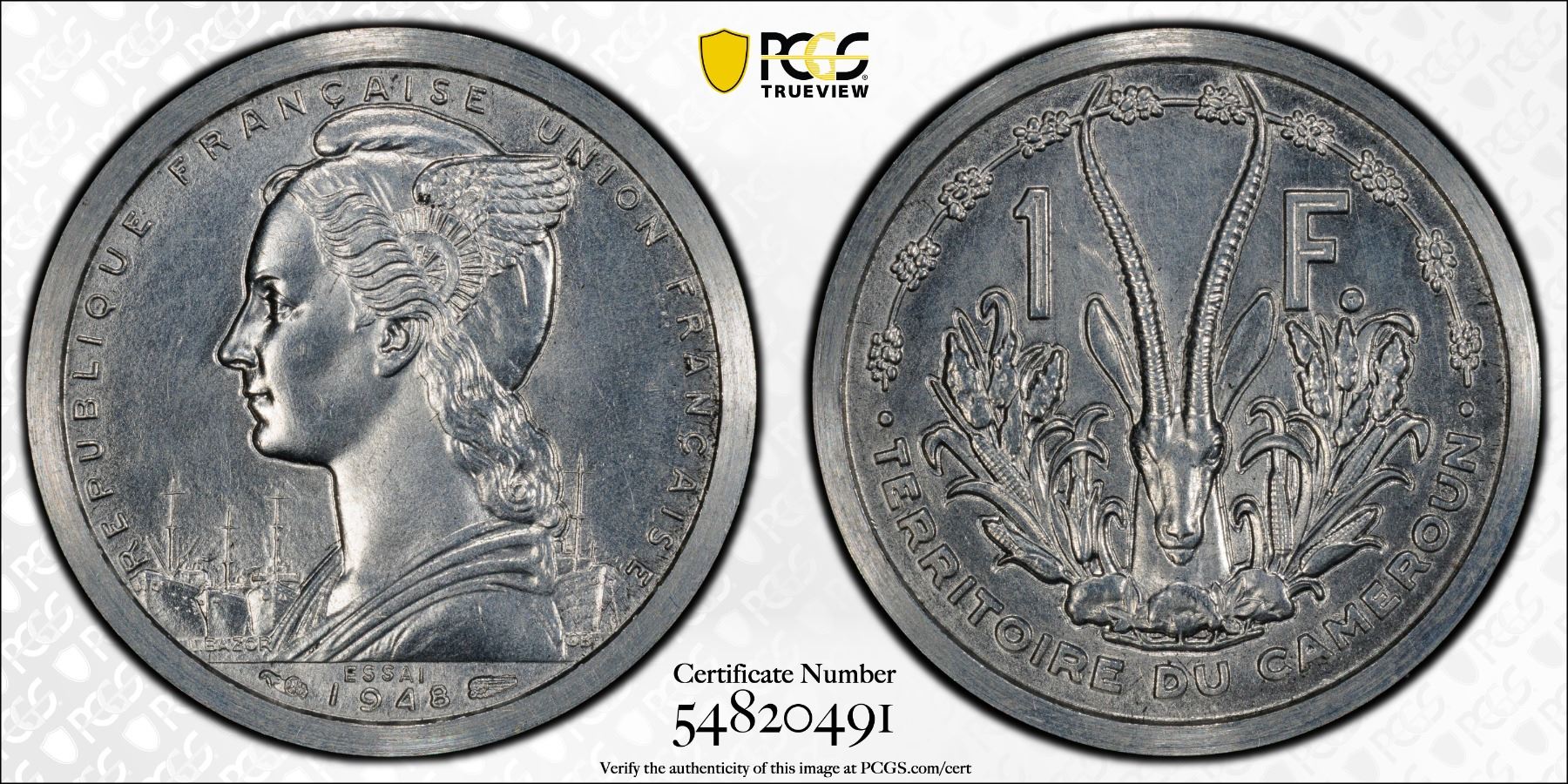 CAMEROUN: French Colony, 1 franc, 1948, KM-PE1, Lec-17, ESSAI piedfort (piéfort) strike, very lustrous, mintage of only 104 pieces, rare, PCGS graded Specimen 65.
