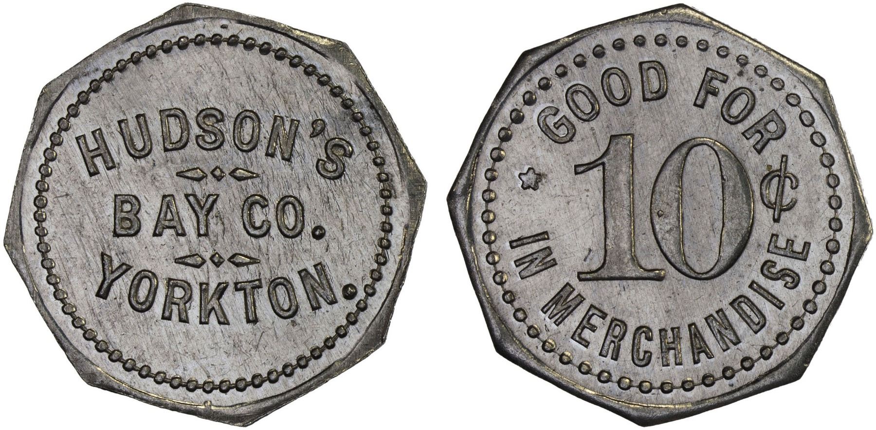 CANADA: 10 cent token, TC-389143, Tannahill-7680g, HUDSON'S / BAY CO. / YORKTON // GOOD FOR / 10¢ / IN MERCHANDISE, AU. The Hudson's Bay store at Yorkton, Saskatchewan was opened in 1898, but these tokens appear to have been issued sometime around WWI. The General manager had them minted and used them to pay local farmers for the produce they brought in. A full set of the tokens would include a 5, 10, 25 and 50 cents, as well as a $1.00 token. Today it is very difficult to assemble a full set, with only the 5 and 10 cents usually available. The Hudson's Bay Company (HBC) is a Canadian holding company of department stores and commercial property. It is the oldest corporation in North America, founded in 1670 and liquidated in 2025, and was headquartered in Toronto and New York City.