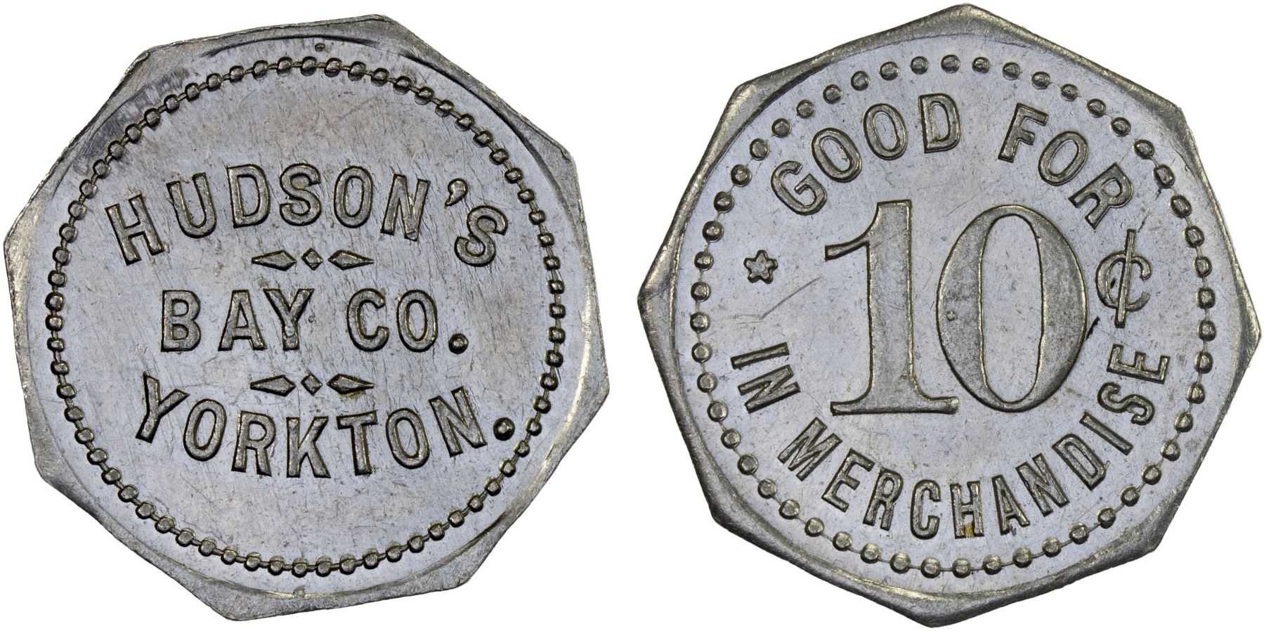 CANADA: 10 cents token (1.32g), ND (after 1898), Gingras-280a, 22mm octagonal aluminum good for token for the Hudson's Bay Company in Yorkton, Saskatchewan, HUDSON'S / BAY CO. / YORKTON. // GOOD FOR / 10¢ / IN MERCHANDISE, reverse rotated about 20 degrees counterclockwise (it's supposed to be medal alignment), rare, plain edge, XF. In his book Medals, Tokens, and Paper Money of the Hudson's Bay Company, Larry Gingras writes: "In 1898 the Hudson's Bay Company opened a small store in Yorkton [Saskatchewan] to provide better service for settlers in the area. Up to this time the settlers obtained their supplies from Winnipeg and had found this to be inconvenient. The Company's business expanded rapidly in the Colony and resulted in their having to enlarge the premises and to eventually construct a new store."