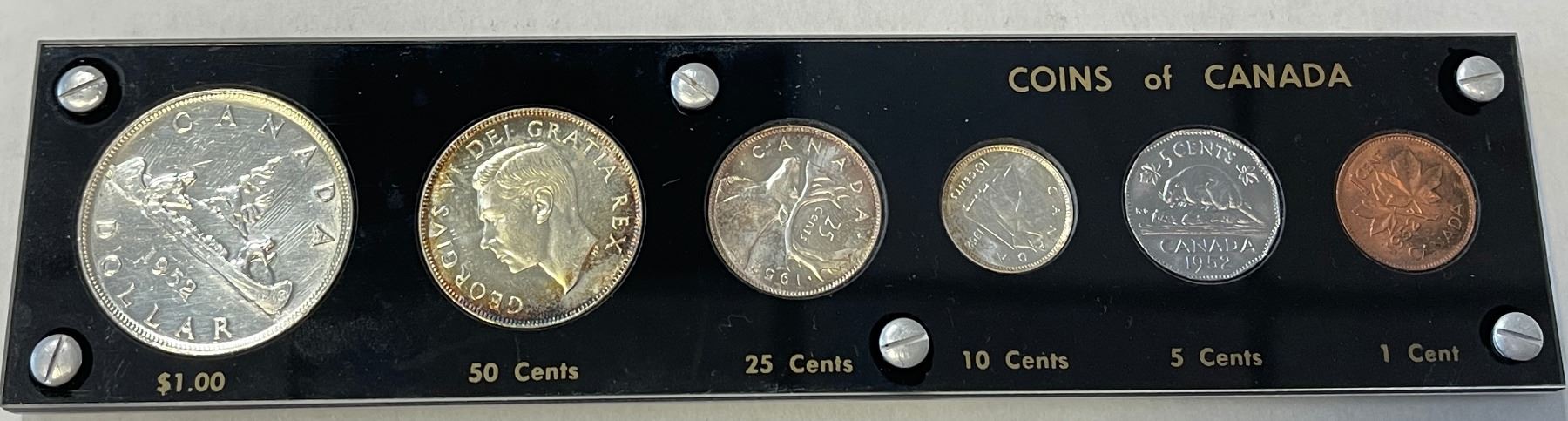 CANADA:1952 6-piece year SET, WL dollar in cleaned Unc, all others in Choice Unc, housed in custom Capital Plastics holder; retail value $110, set of 6 pieces.