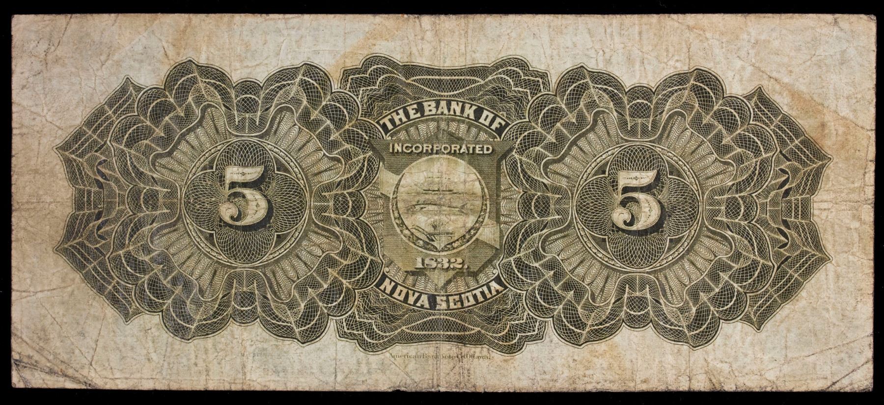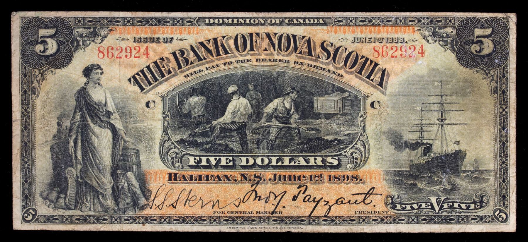 CANADA: 5 dollars, 1898, Pick-S619a, Charlton-550-28-06, Bank of Nova Scotia, signed Payzant, S/N 862924pp C, printed by ABNC Ottawa, a very rare note with few auction records, VF. The Bank of Nova Scotia was formed in 1832, and was made up of a group of merchants and ship owners. With the building of the Canadian Pacific Railway in the 1880s, the bank established branches in Winnipeg and Minneapolis. Branches were added in Chicago in 1890 and in Boston in 1899. The face design shows an allegorical female figure, a mining scene and a steamship approaching.