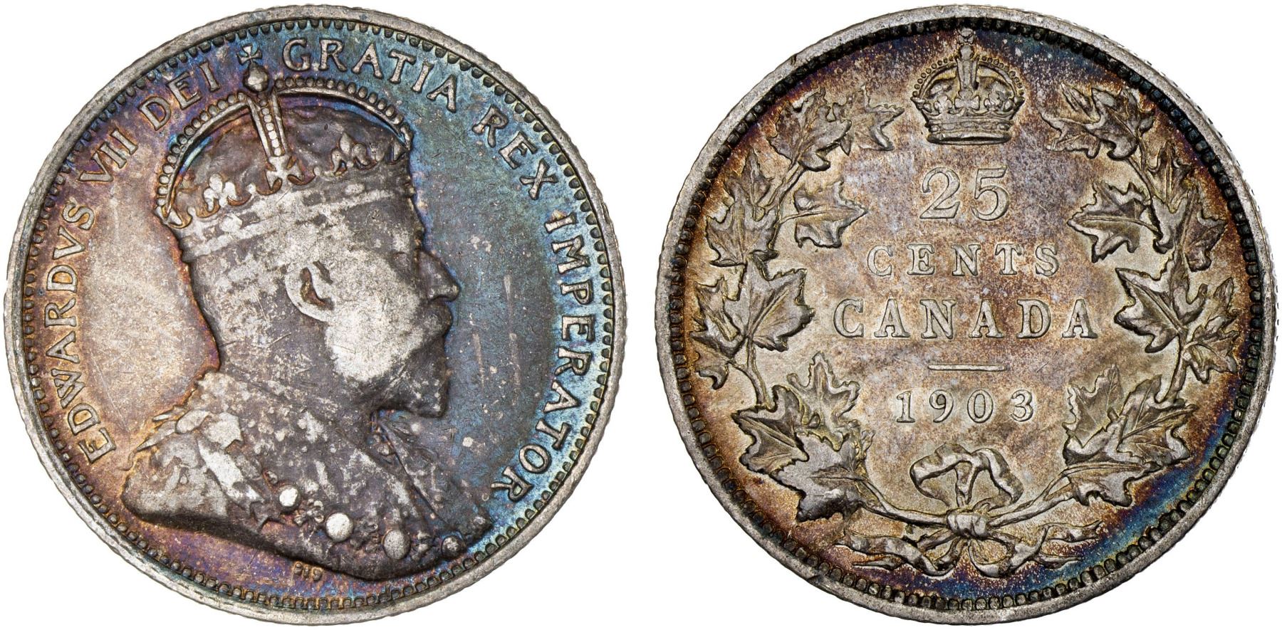 CANADA: Edward VII, 1901-1910, AR 25 cents, 1903, KM-11, flat cheek, uneven colorful tone, some lustre, better date, About XF.