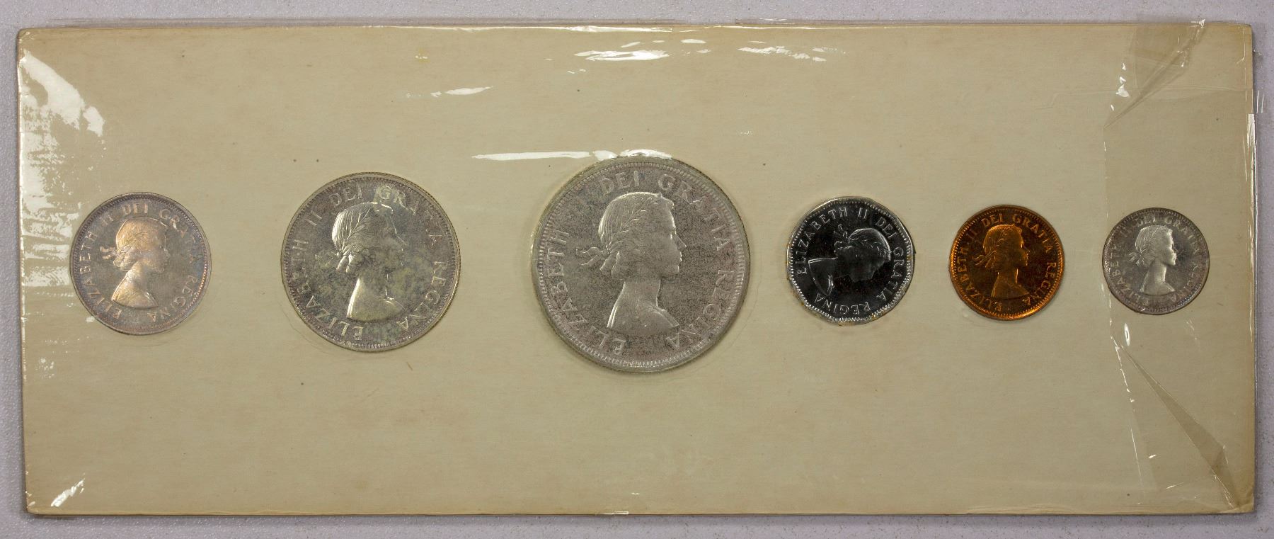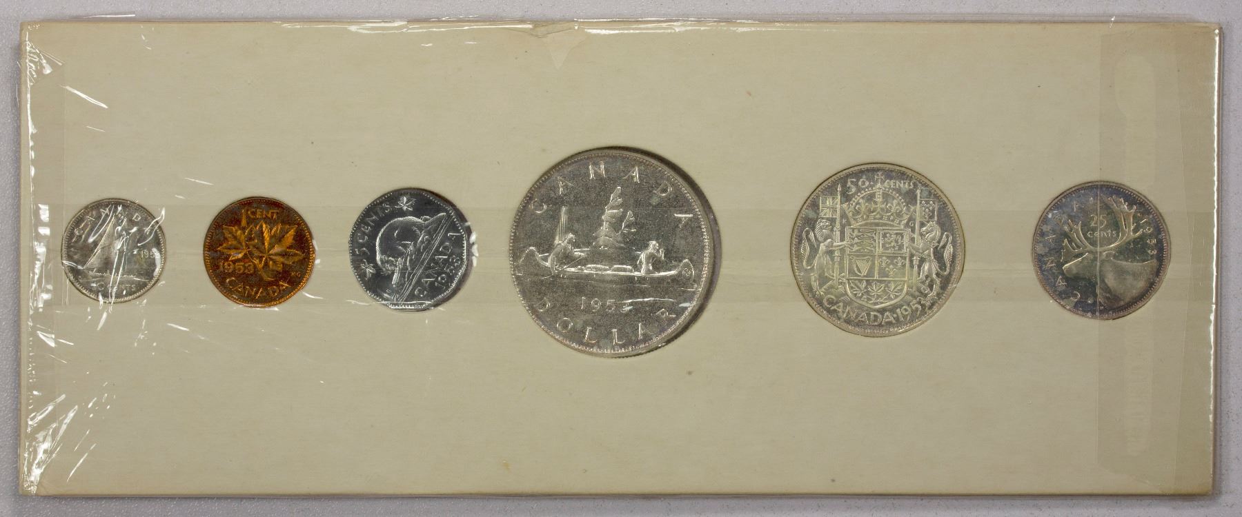 CANADA: Elizabeth II, 1952-2022, 6-piece prooflike set, 1953, KM-PL1var, all coins (KM-49 through 54) have the shoulder fold variety, in original white card with no identification stamp, all coins are choice, a few with light toning, mintage of only 1,200 sets for both shoulder varieties, maybe the first of these we have handled, set of 6 coins.