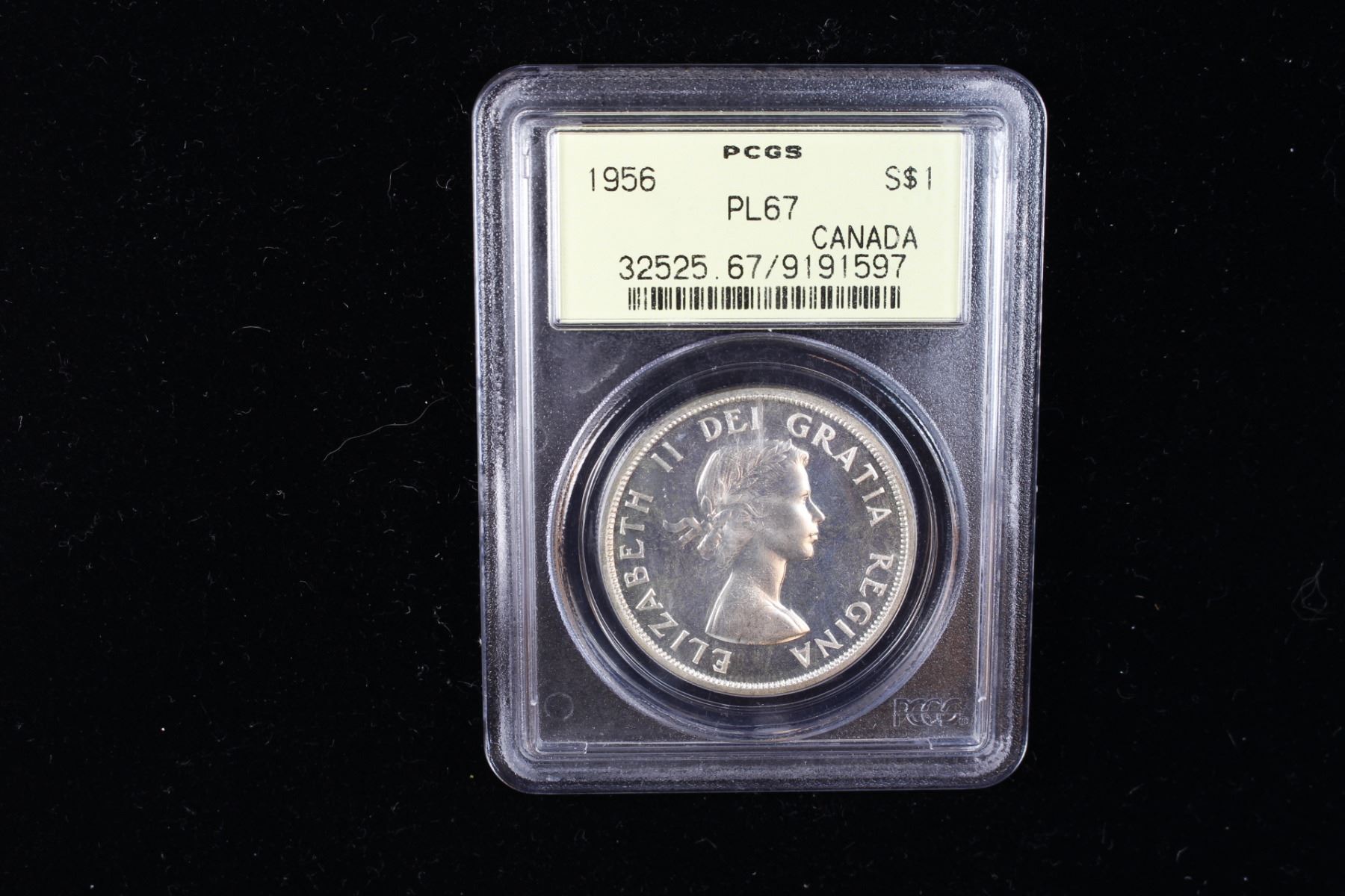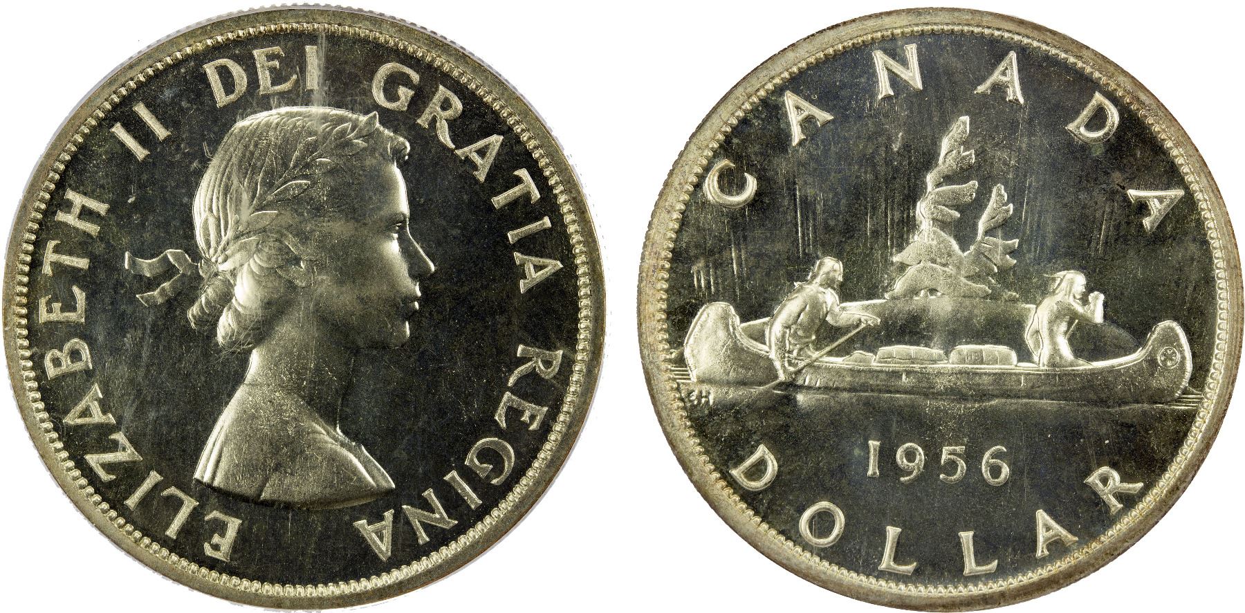 CANADA: Elizabeth II, 1952-2022, AR dollar, 1956, KM-54, OGH ("Old Green Holder"), PCGS graded ProofLike Unc 67.