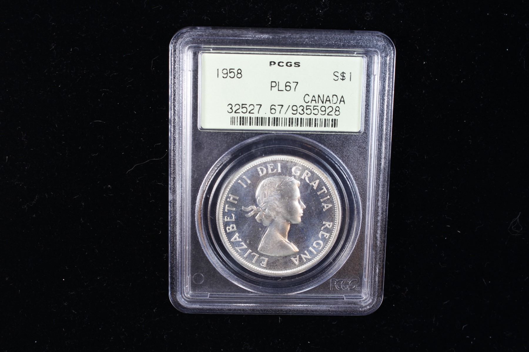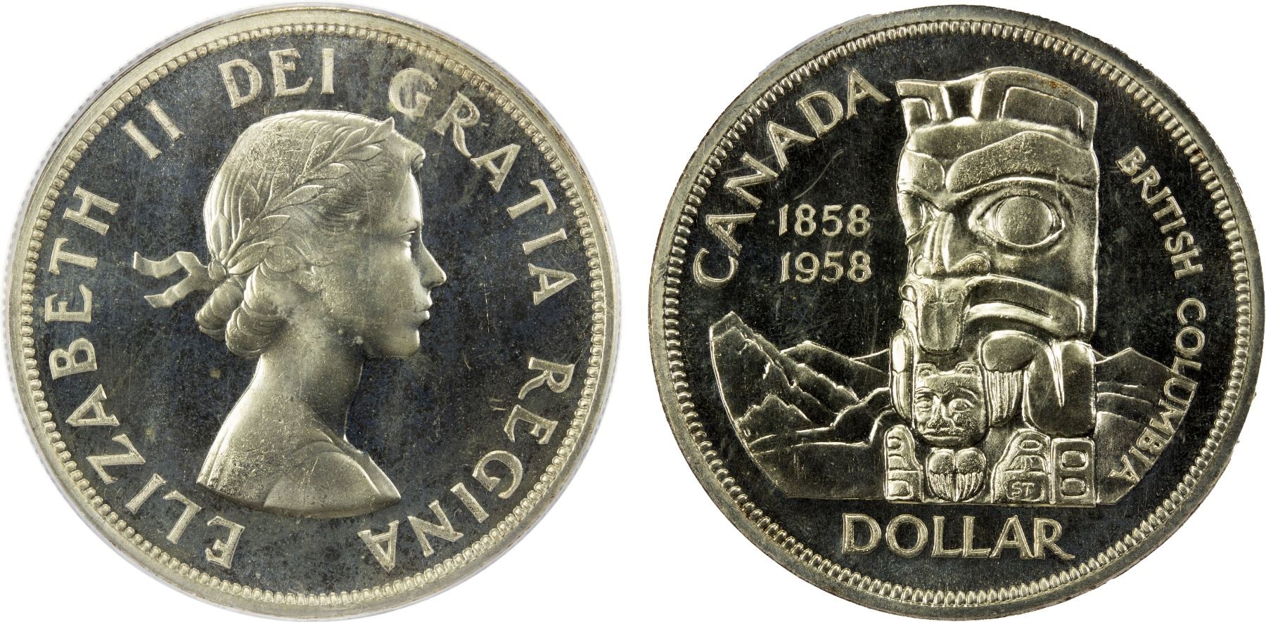 CANADA: Elizabeth II, 1952-2022, AR dollar, 1958, KM-55, British Columbia Centennial, OGH ("Old Green Holder"), PCGS graded ProofLike Unc 67.