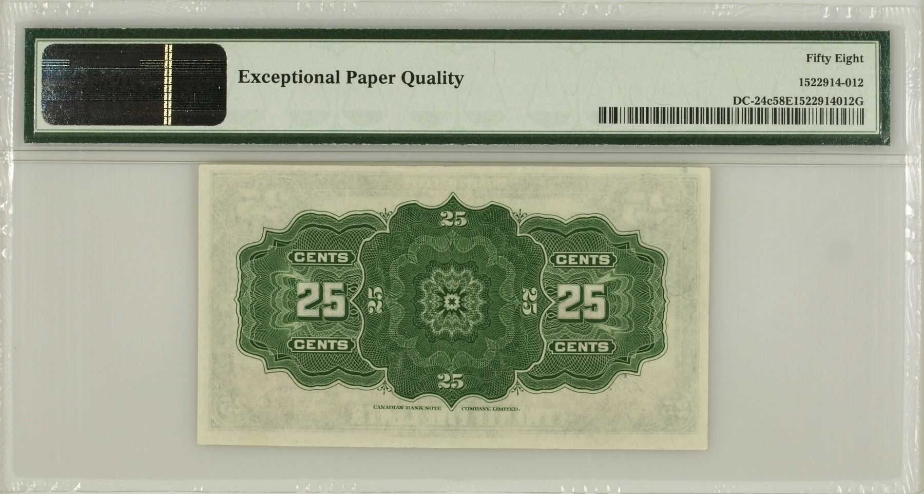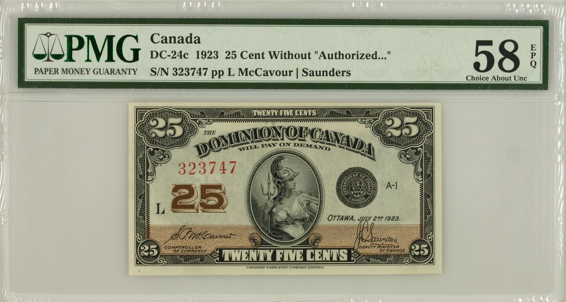 CANADA: George V, 1910-1936, 25 cents, 2.7.1923, Pick-11b, DC-24c, McCavour-Saunders signatures, without "AUTHORIZED BY." text, PMG graded AU58 EPQ, ex Dr. Robert A. Rosenfeld Collection.