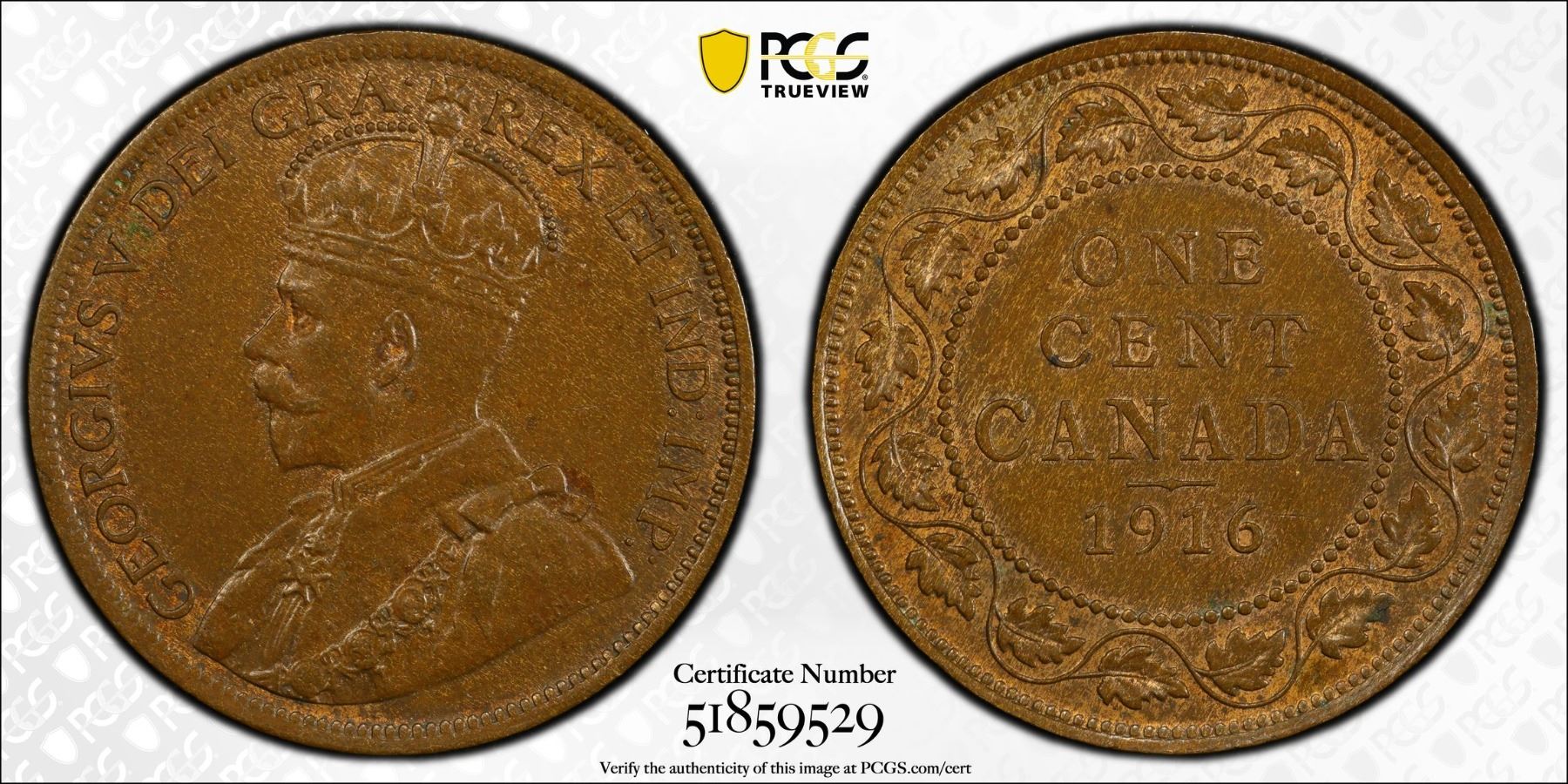 CANADA: George V, 1910-1936, AE cent, 1916, KM-21, PCGS graded MS64 BN, ex Almer H. Orr III Collection.
