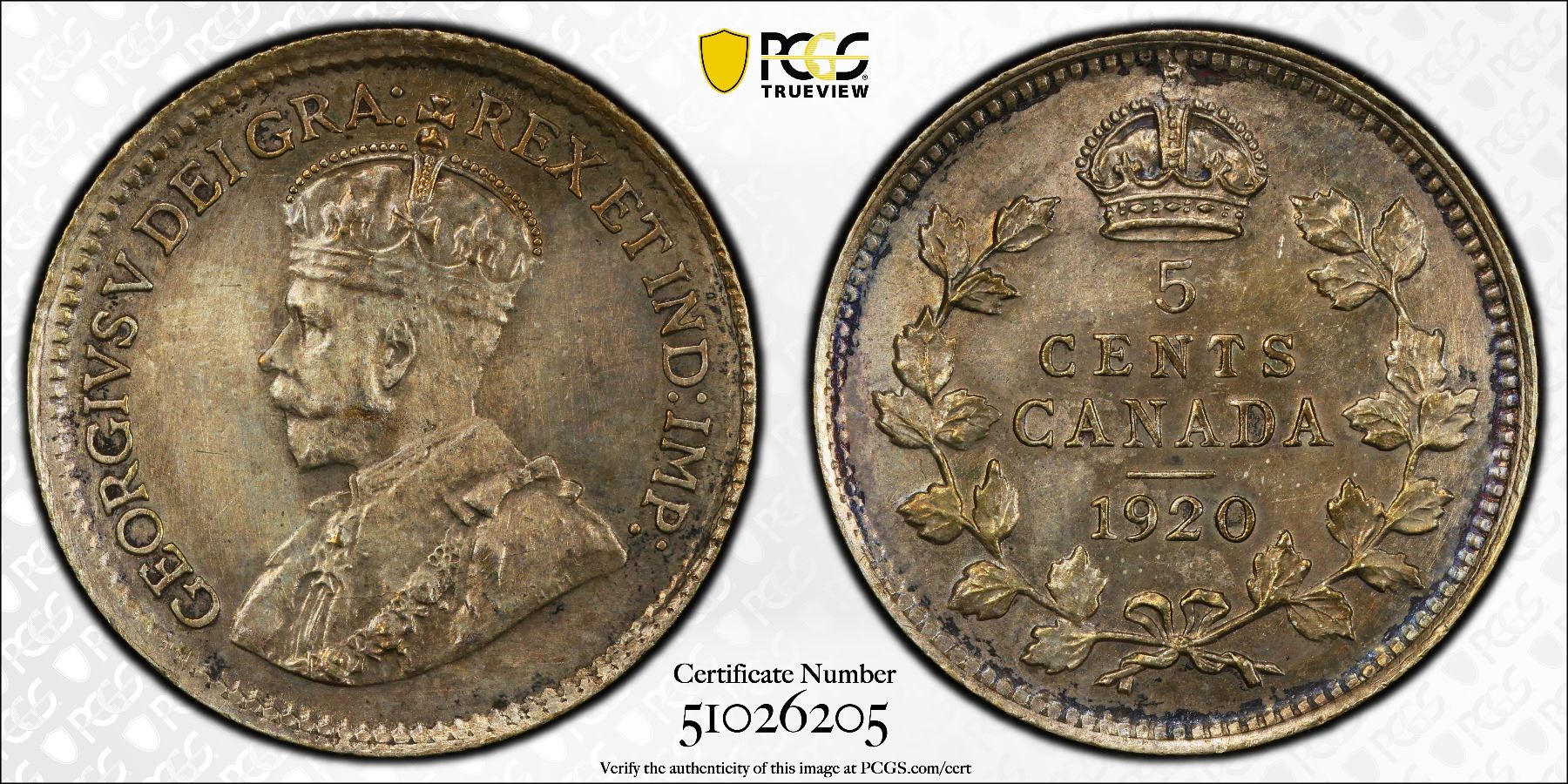CANADA: George V, 1910-1936, AR 5 cents, 1920, KM-22a, once lightly cleaned and re-toned, PCGS graded AU details, ex Almer H. Orr III Collection.
