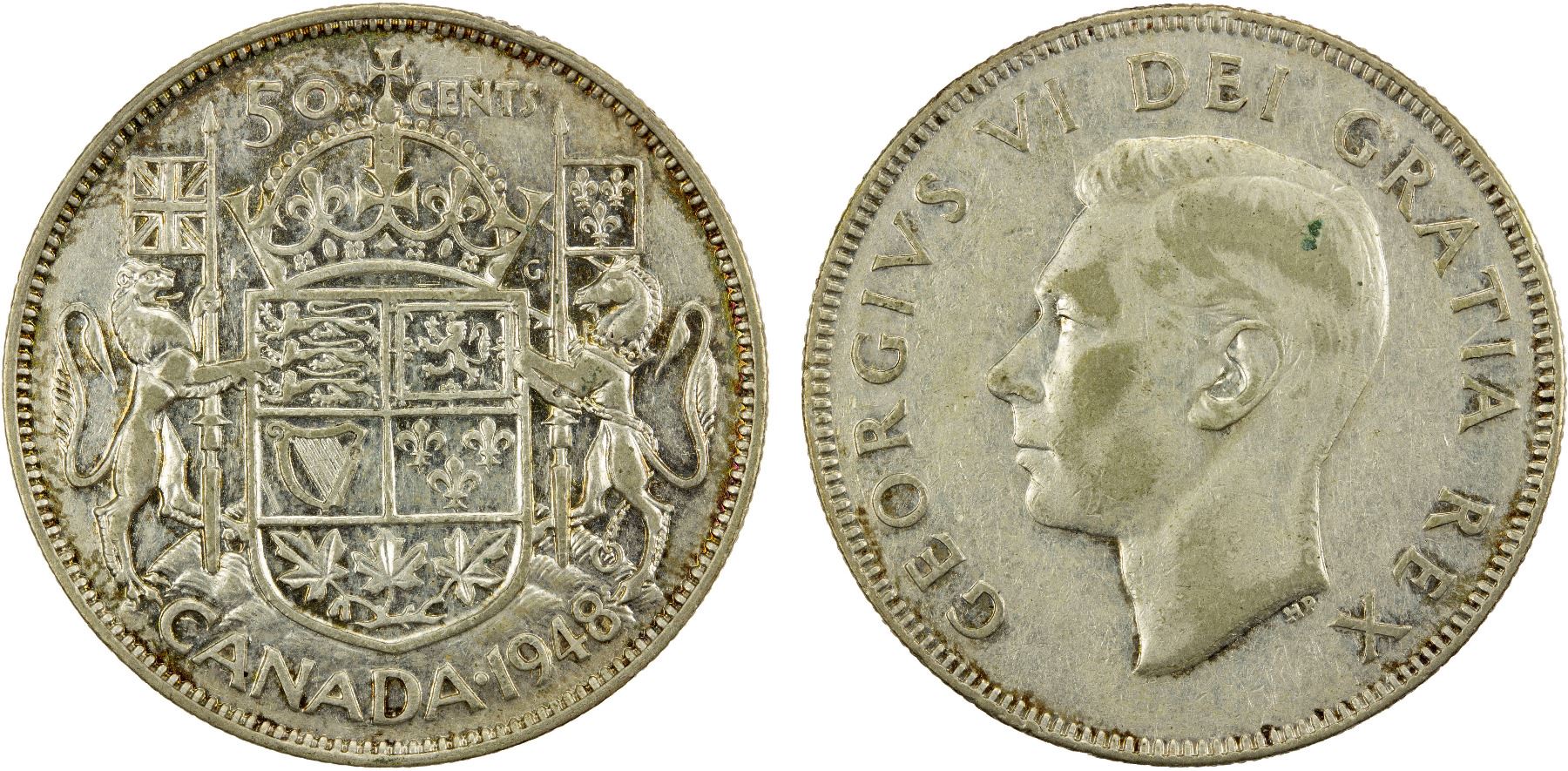 CANADA: George VI, 1936-1952, AR 50 cents, 1948, KM-45, key date, VF.