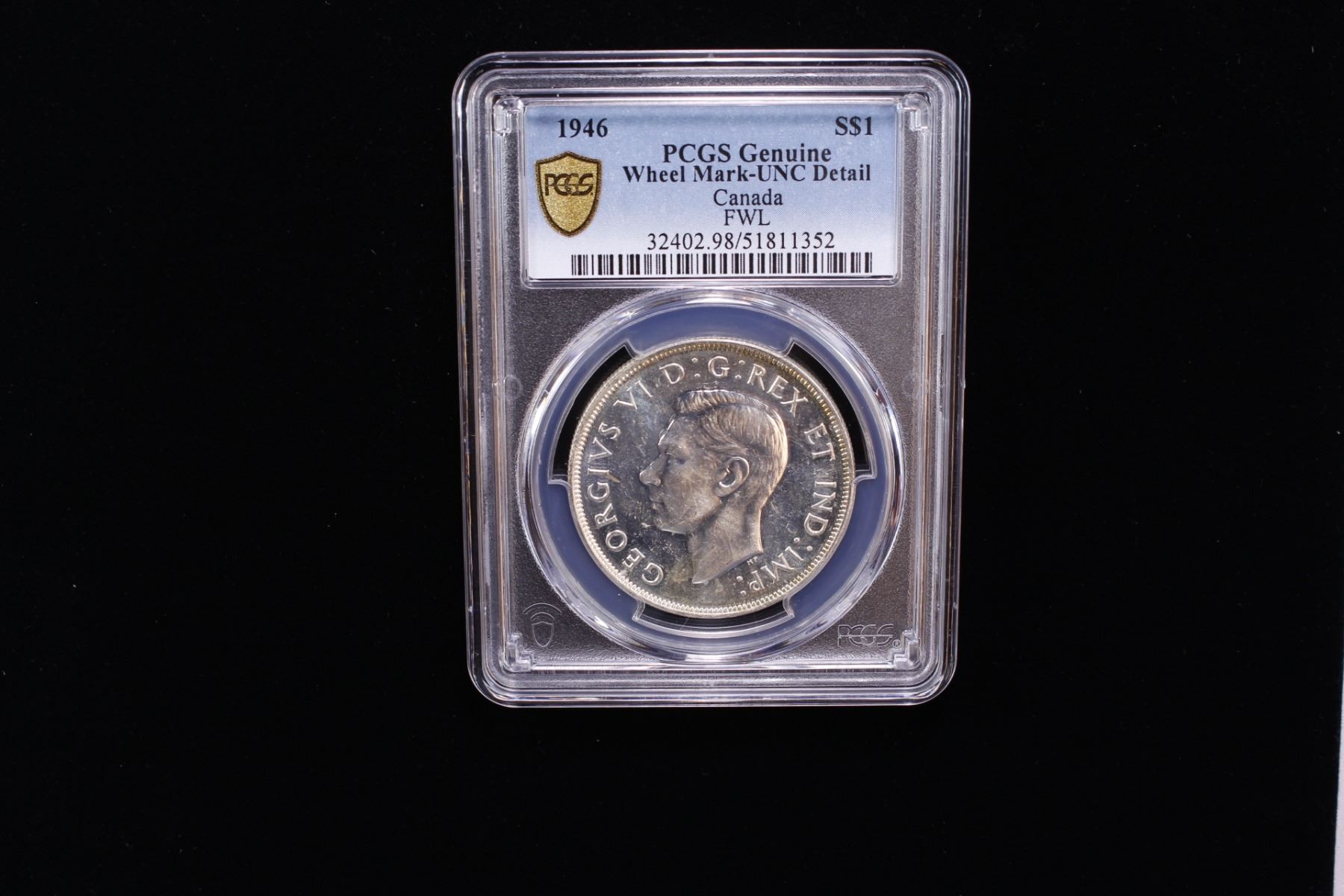 CANADA: George VI, 1937-1952, AR dollar, 1946, KM-37, Double HP variety, "wheel marks" (from a coin counting machine), PCGS graded UNC details, ex Almer H. Orr III Collection.
