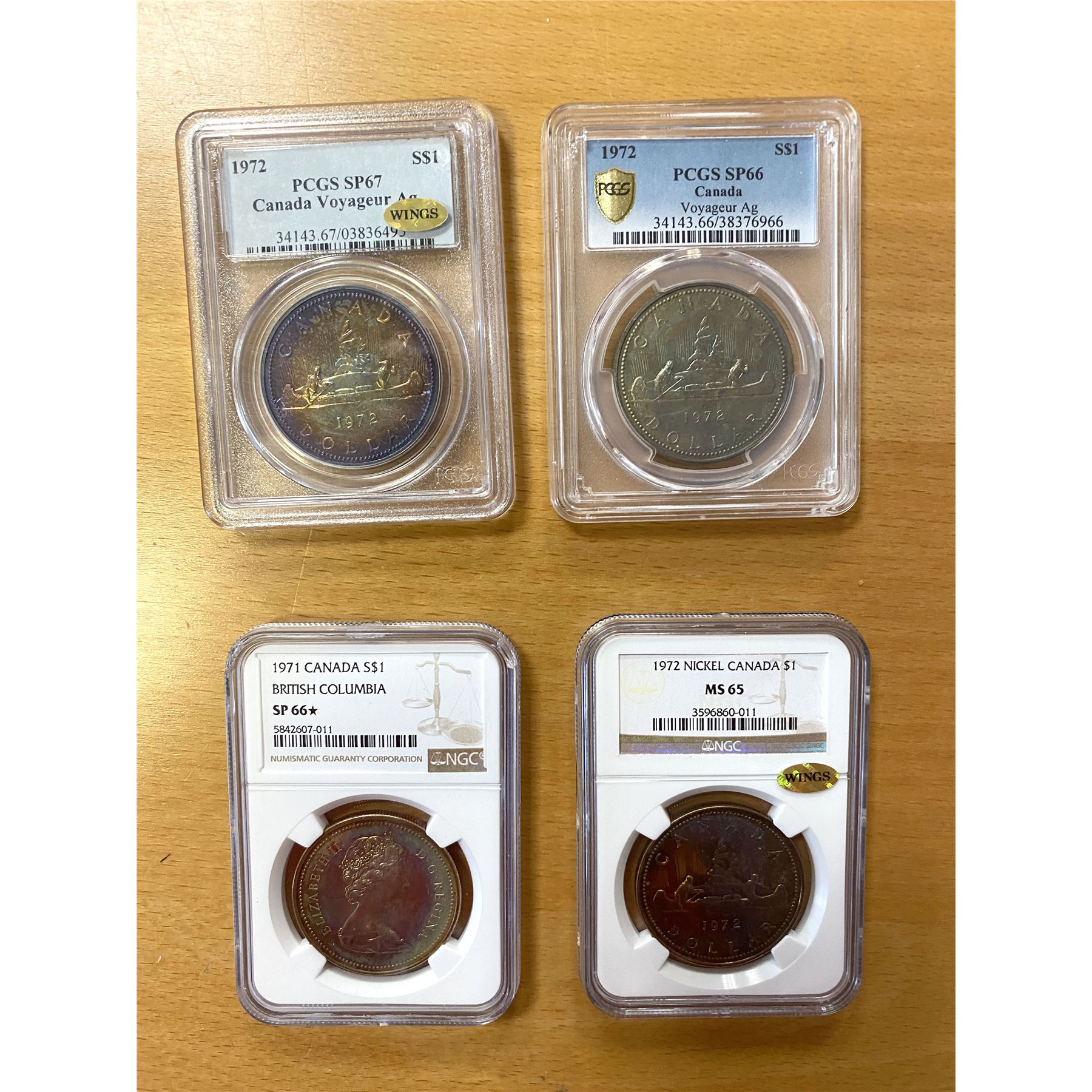 CANADA: LOT of 4 AR Dollars, all with remarkable rainbow toning: 1971 NGC SP 66 *, 1972 NGC MS 65 Gold Wings (incorrectly labeled Nickel and incorrectly labeled MS, as it should be SP), 1972 PCGS SP66, and 1972 PCGS SP67 Gold Wings; all are toned on both sides, a quality lot, retail value $175, lot of 4 pieces.
