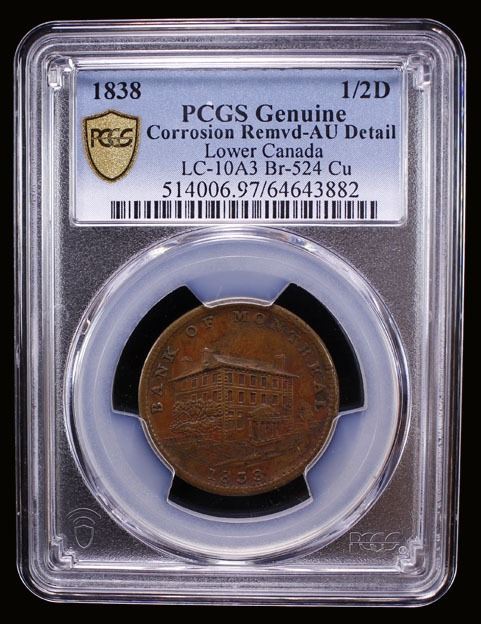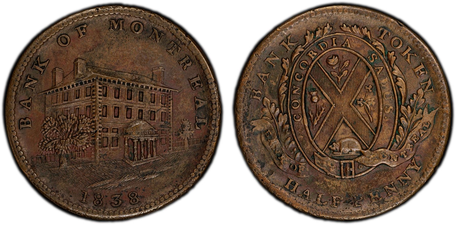LOWER CANADA: AE halfpenny token, 1838, KM-Tn15, Br-524, LC-10A3, Bank of Montreal copper "side view" type, plain edge, medal alignment, variety with 11 palings in left fence, environmental damage but still much more attractive than usual for type, PCGS graded AU details.