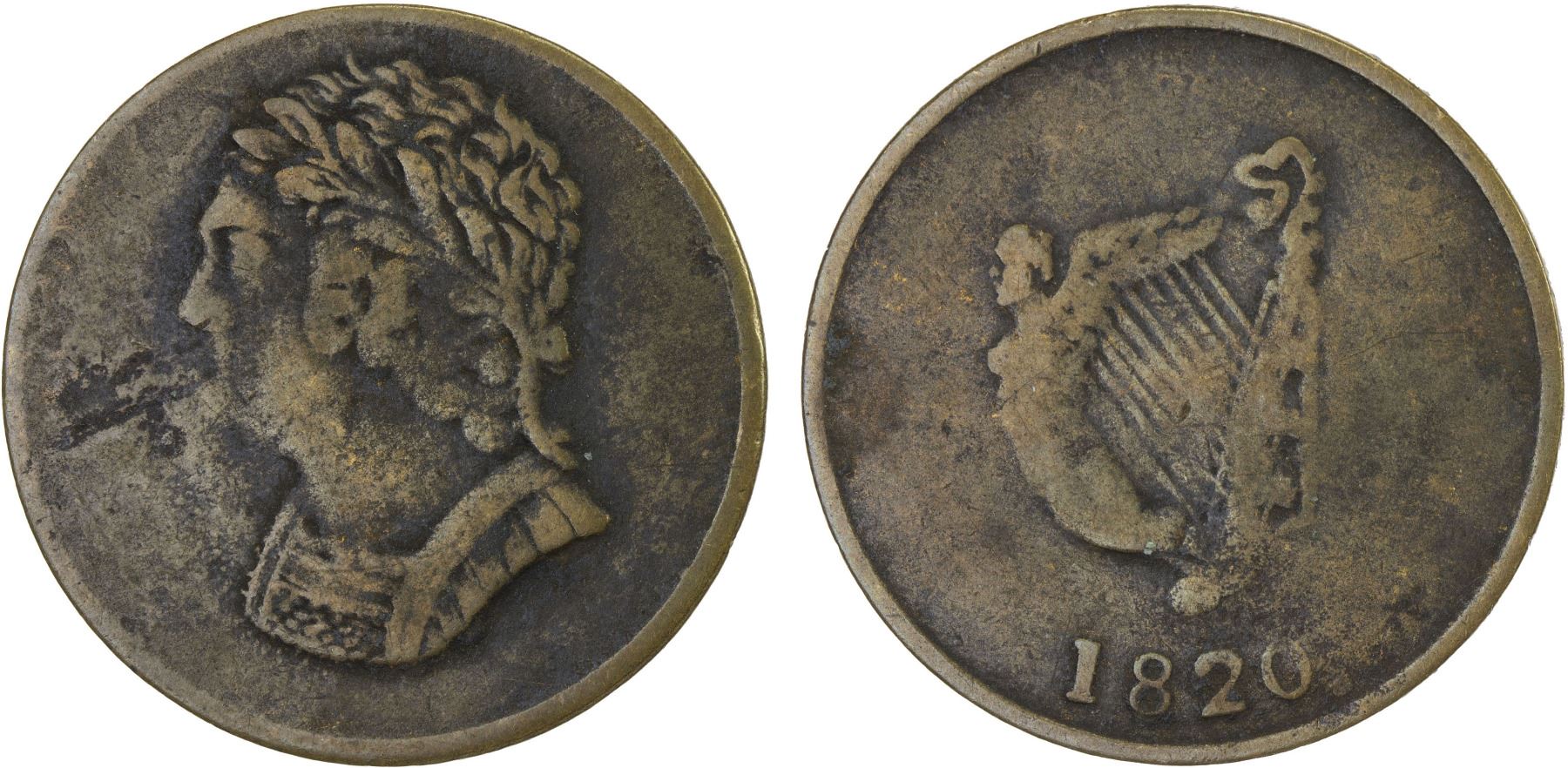 LOWER CANADA: George III, 1760-1820, AE halfpenny token (4.91g), 1820, Charlton-LC-60-10, small lamination defect in left obverse field, rare variety, F-VF.