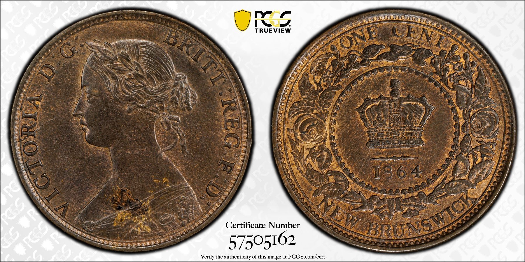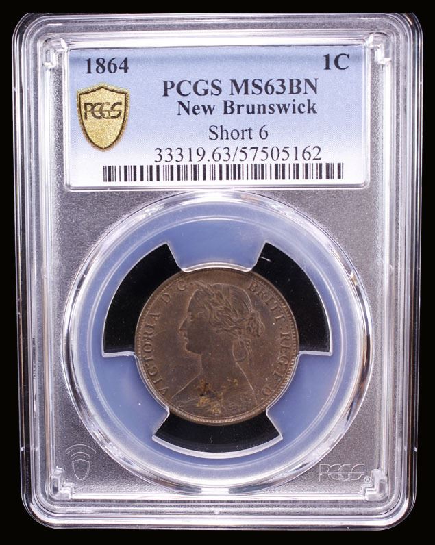 NEW BRUNSWICK: Victoria, 1837-1867, AE cent, 1864, KM-6, variety with short 6, PCGS graded MS63 BN.