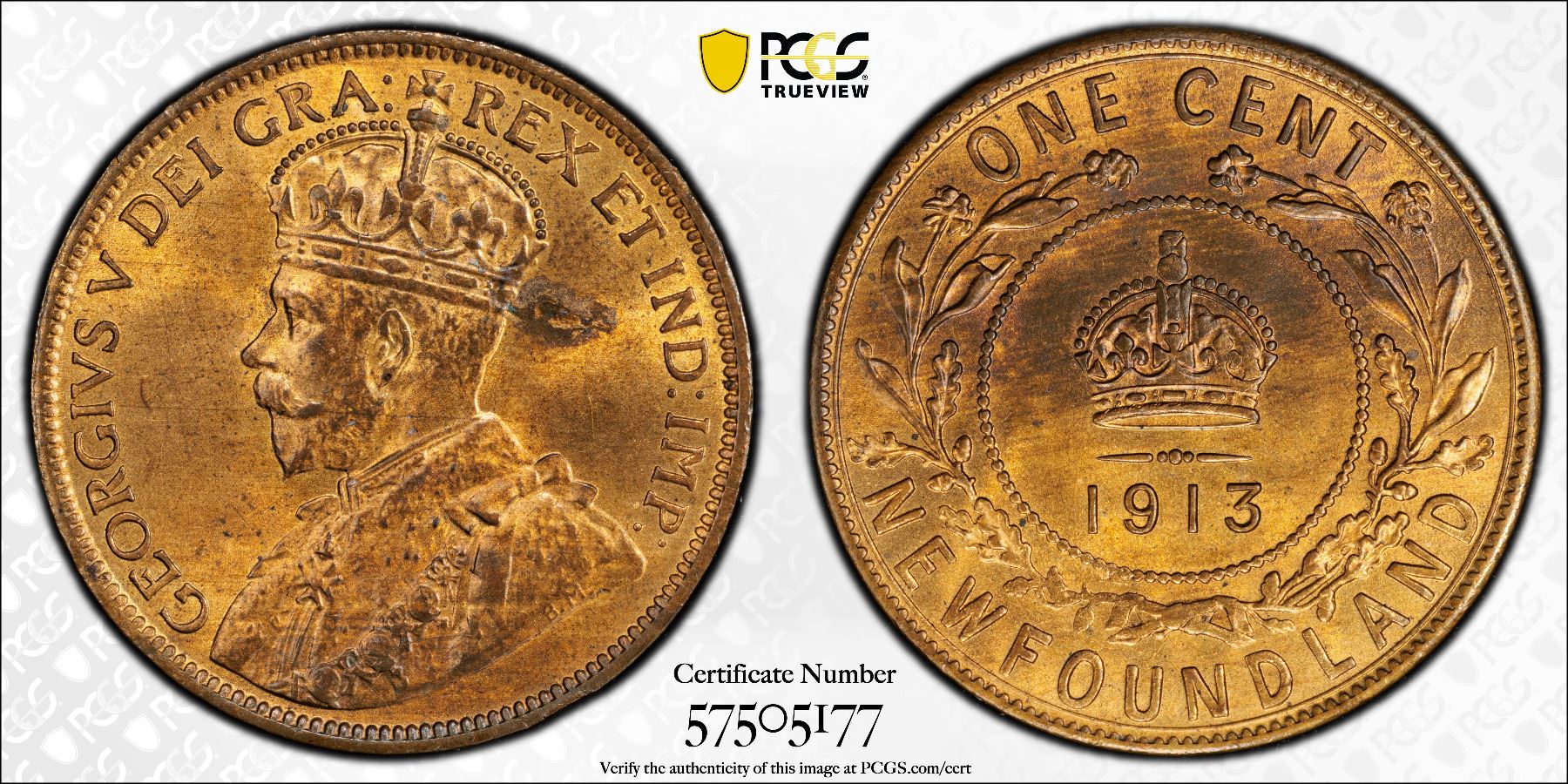 NEWFOUNDLAND: George V, 1910-1936, AE cent, 1913, KM-16, lovely orange luster, PCGS graded MS64 RB.