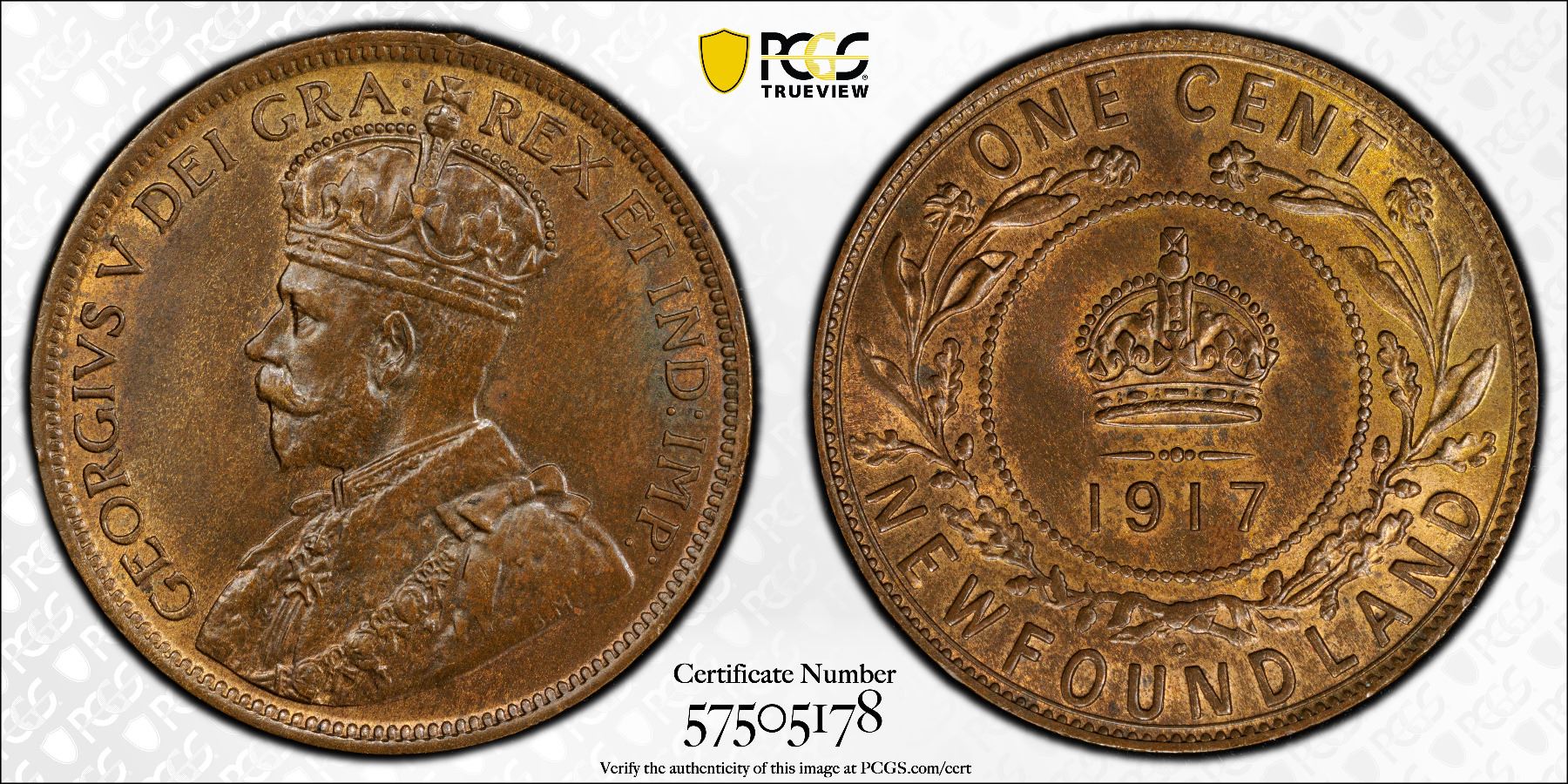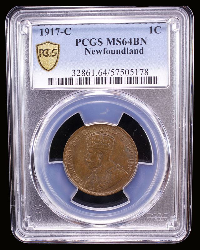 NEWFOUNDLAND: George V, 1910-1936, AE cent, 1917-C, KM-16, attractive luster, PCGS graded MS64 BN.