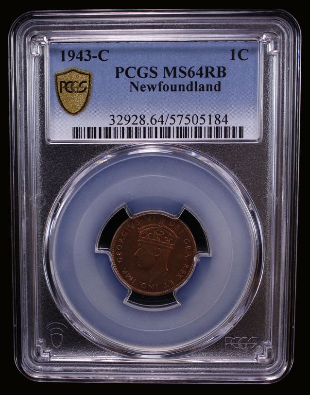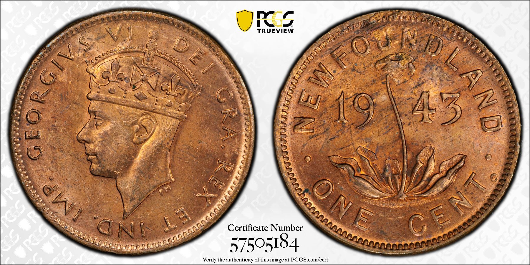 CANADA: NEWFOUNDLAND: George VI, 1936-1952, AE cent, 1943-C, PCGS MS64 RB