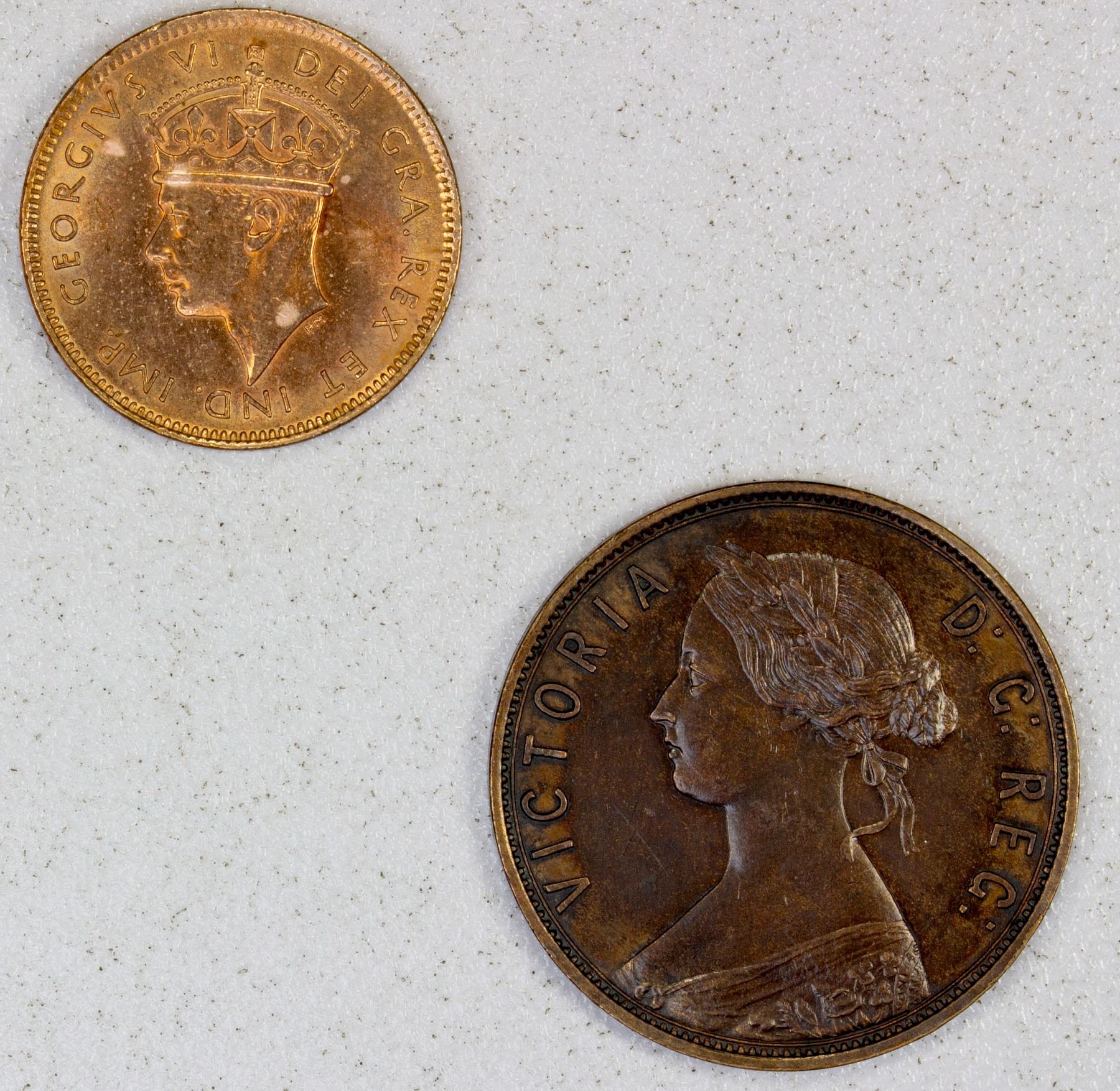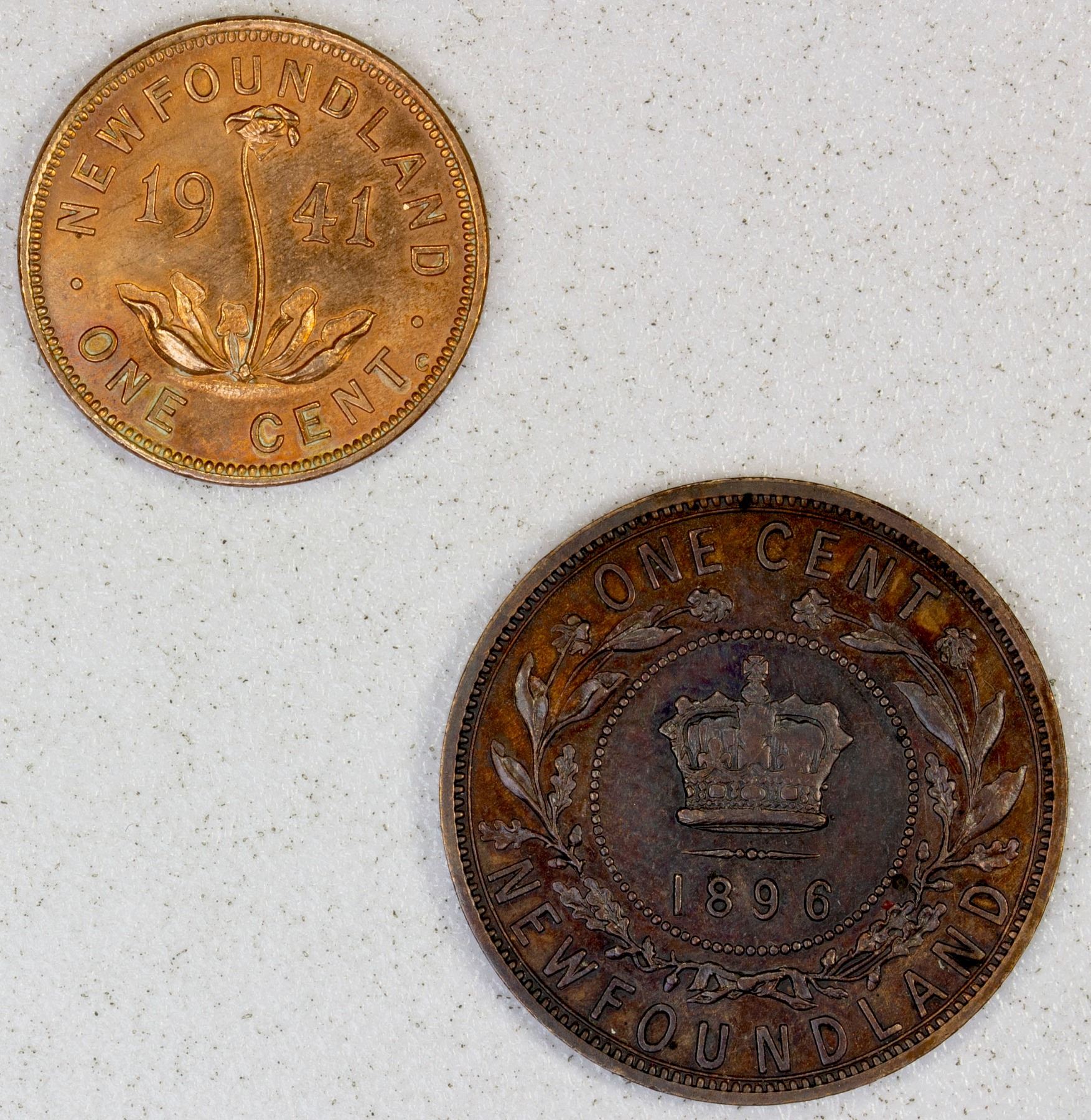 CANADA: NEWFOUNDLAND: LOT of 2 coins, pair of two copper coins, Victoria 1896 cent in AU quality, and George VI 1941 in UNC quality with light surface hairlines, lot of 2 coins.