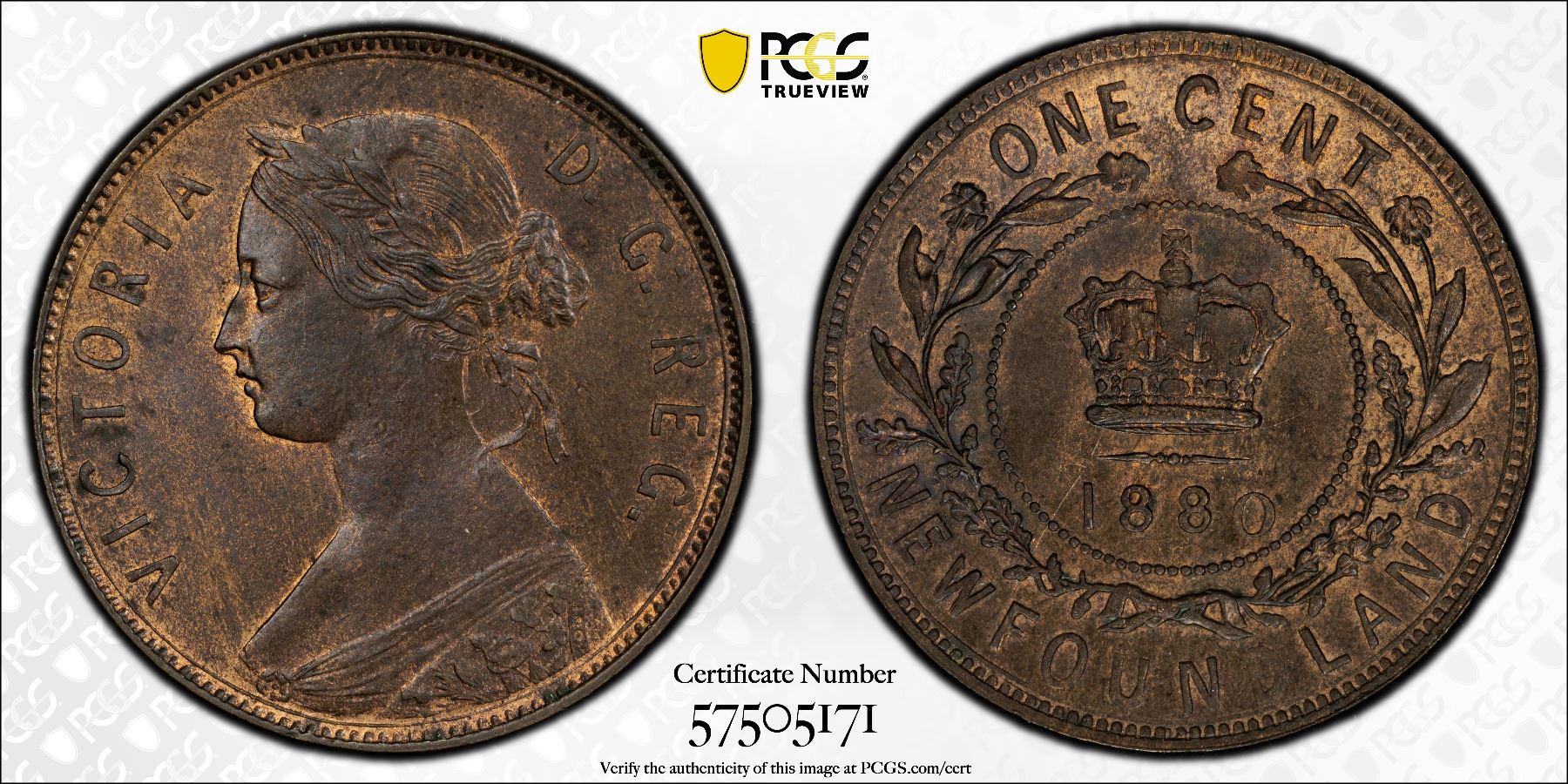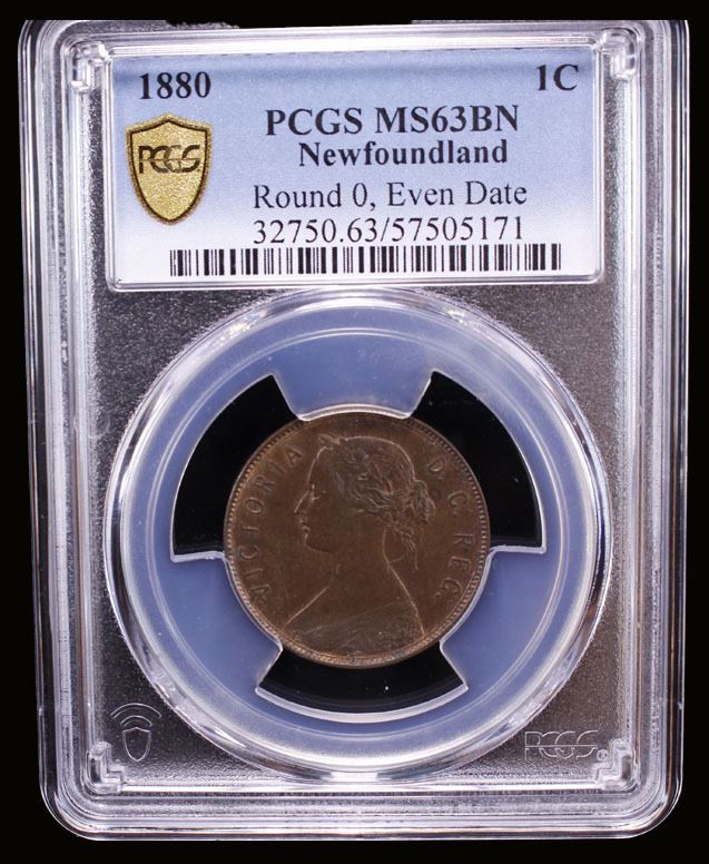 NEWFOUNDLAND: Victoria, 1837-1901, AE cent, 1880, KM-1, variety with round 0 and even date, PCGS graded MS63 BN.