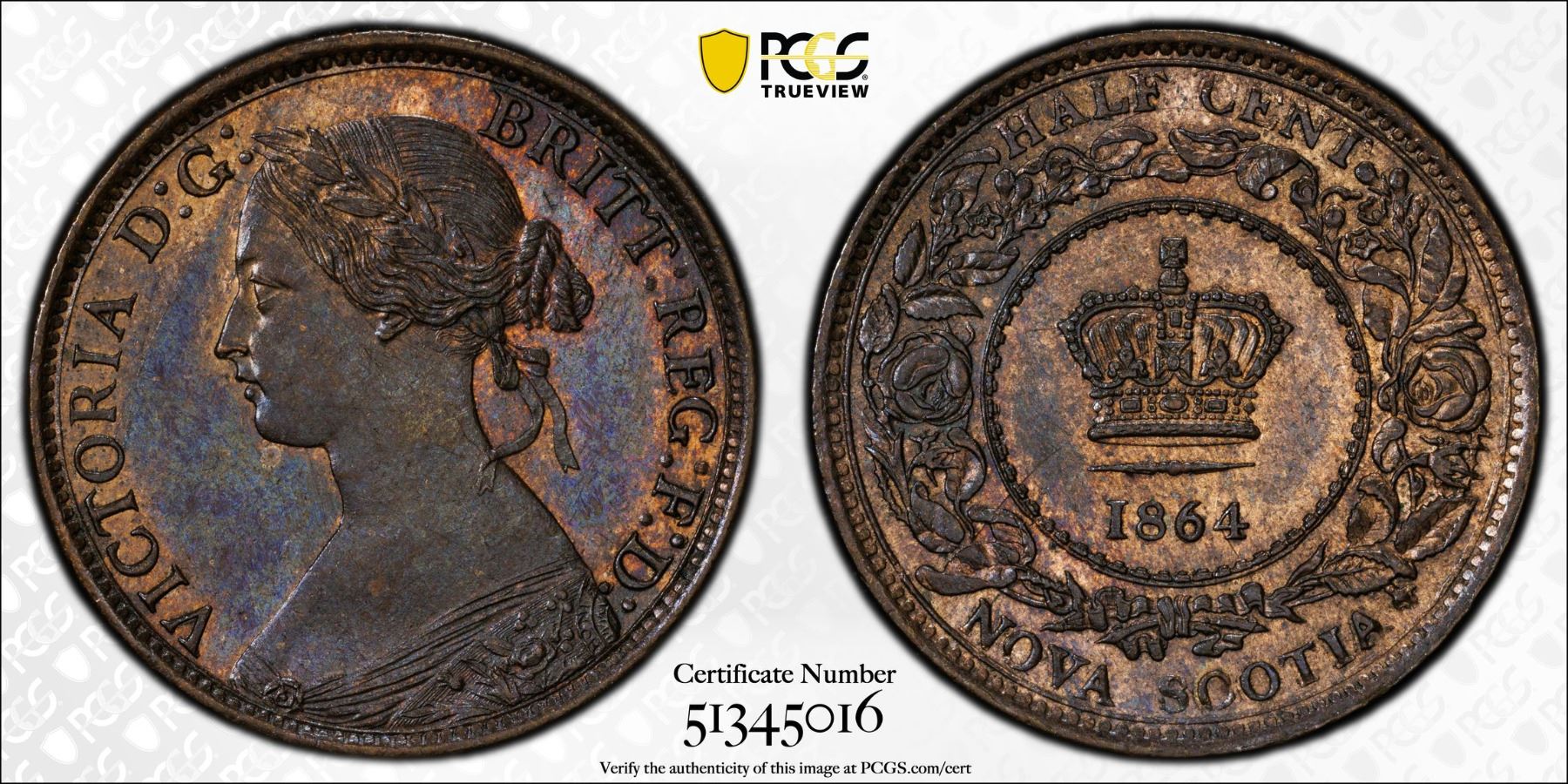 CANADA: NOVA SCOTIA: Victoria, 1837-1867, AE 1/2 cent, 1864, KM-7, a wonderful lustrous mint state example! PCGS graded MS64 BN. Nova Scotia decided to adopt a decimal system of currency in 1861. The half cent have the same diameter as the British farthing and the cent as the half penny. The British North America Act by which Nova Scotia became part of the Dominion of Canada, went into effect on July 1, 1867.