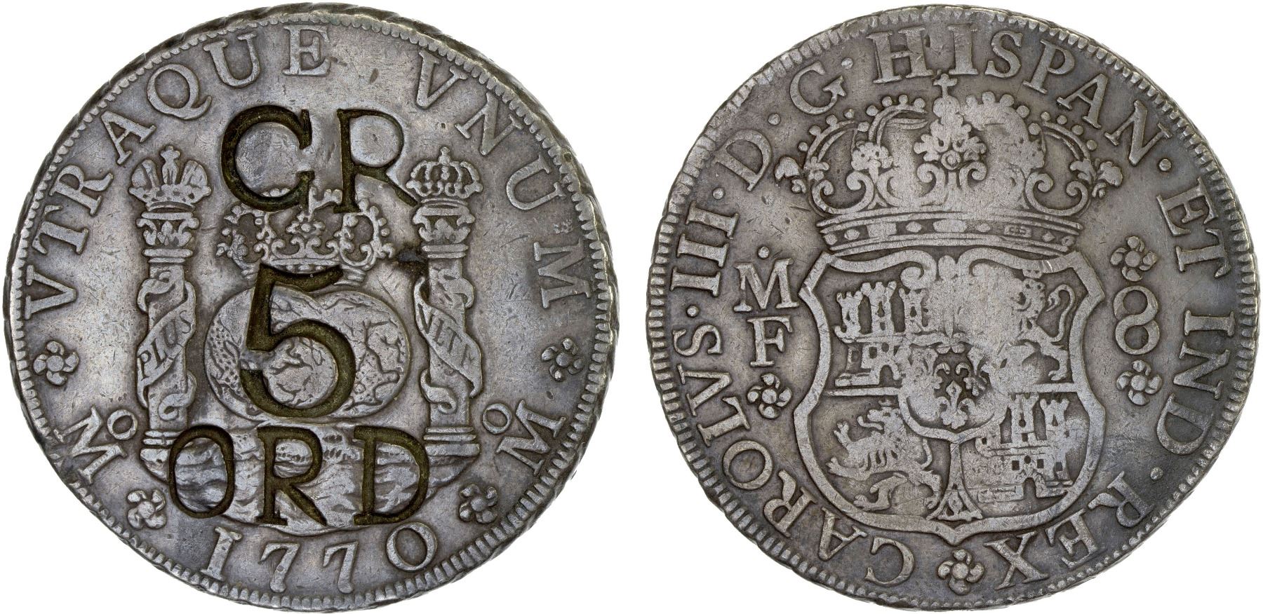 PRINCE EDWARD ISLAND: AR 5 shillings, ND, cf. Bonham's Patterson Collection Sale, Lots 540 through 543, fantasy issue, with "GR / 5 / ORD" countermark on reverse of 1770-MoMF Mexico 8 reales Pillar, the "5" being the denomination, so-called Canadian Ordinance issue, rare, VF on Very Fine host, ex Money Company Auction, May 1985, Lot 268. There are several varieties of countermarks, in font size, host coins, obverse vs. reverse, etc.