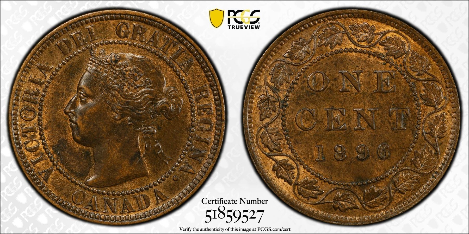 CANADA: Victoria, 1867-1901, AE cent, 1896, KM-7, an attractive example, PCGS graded MS62 BN, ex Almer H. Orr III Collection.