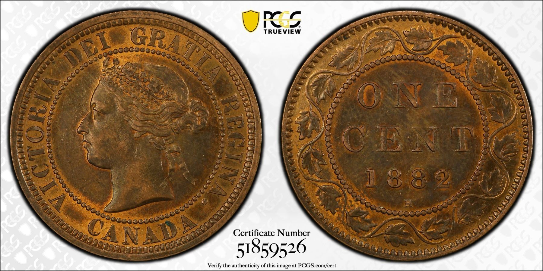CANADA: Victoria, 1867-1901, AE cent, Heaton, 1882-H, KM-7, PCGS graded AU58, ex Almer H. Orr III Collection.