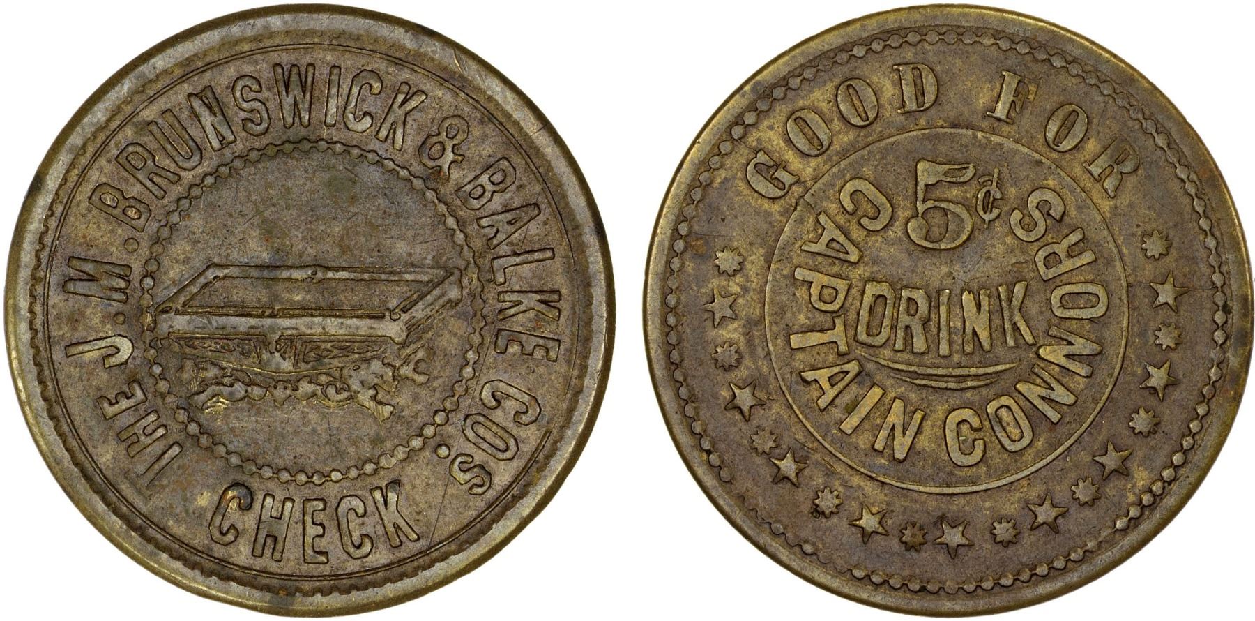 CANADA: token (5.03g), ND (ca. 1890?), BB-6a (tokencatalog.com), 25mm silvered brass token for Captain Connors (Saloon?), 5¢ / DRINK / CAPTAIN CONNORS all within inner circle with GOOD FOR above and stars below // pool table within beaded circle with THE J.M.BRUNSWICK & BALKE COs. - CHECK around, plain edge, F-VF. We were not able to find this token online or in any of our extensive Canada library listings. The Canada attribution comes from our consignor, and may not be correct.