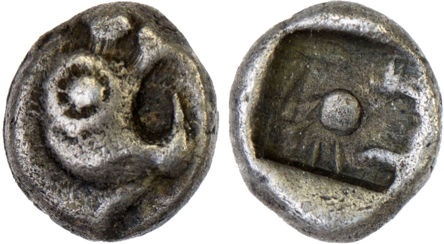 CARIA: Uncertain Mint, AR hemiobol (0.34g), ca. 5th century BC, HN Online-2129, head of griffin right // stylized lion scalp within incuse square, unpublished, VF, ex James Lamb Collection.