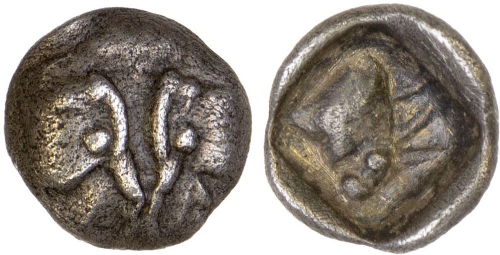 CARIA: Uncertain Mint, AR tetartemorion (0.14g), ca. 5th century BC, cf. SNG Kayhan 969, confronted bull heads // forepart of bull right within incuse square, faint scratches on reverse, VF, ex James Lamb Collection, ex Busso Peus.