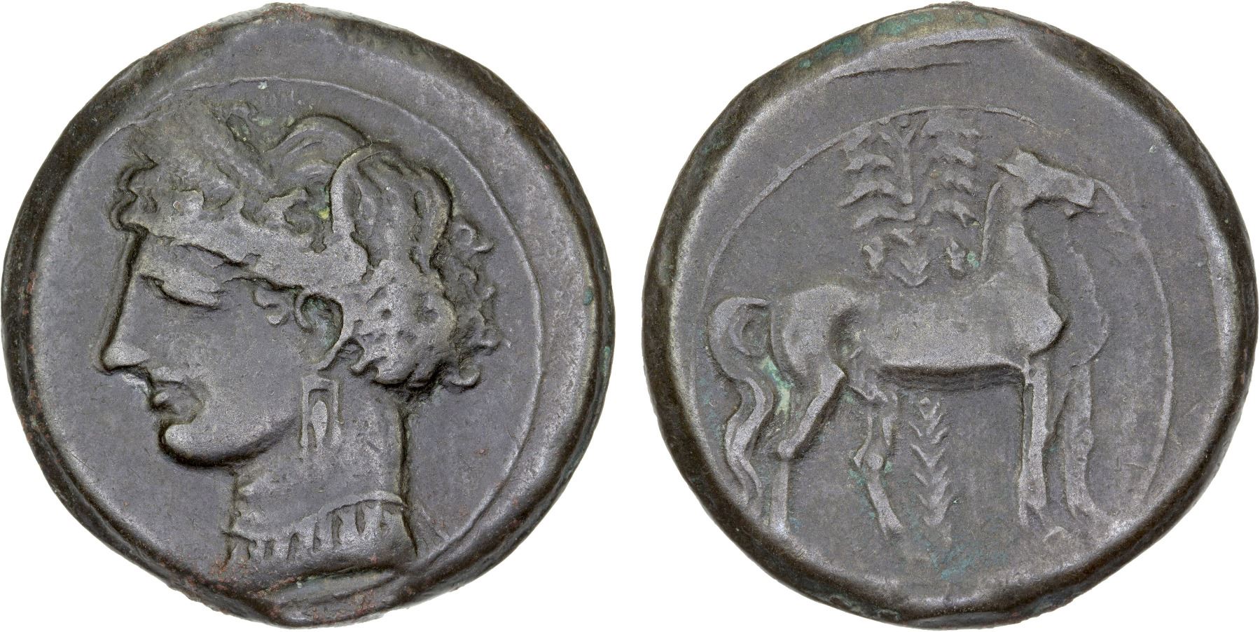 CARTHAGE: BI tridrachm (12.63g), ca. 210-205 BC, SNG Copenhagen 351, Second Punic War issue, head of Tanit left // horse standing right, palm tree in background, faint die shift on reverse, glossy brown patina, VF.
