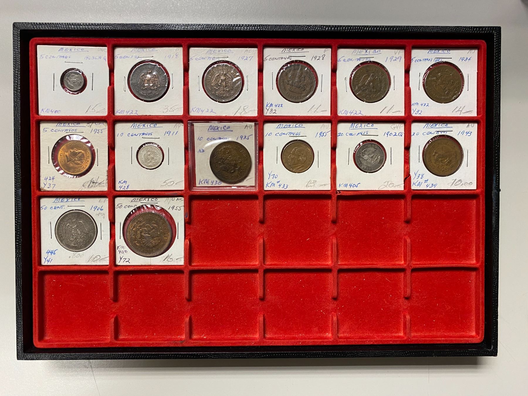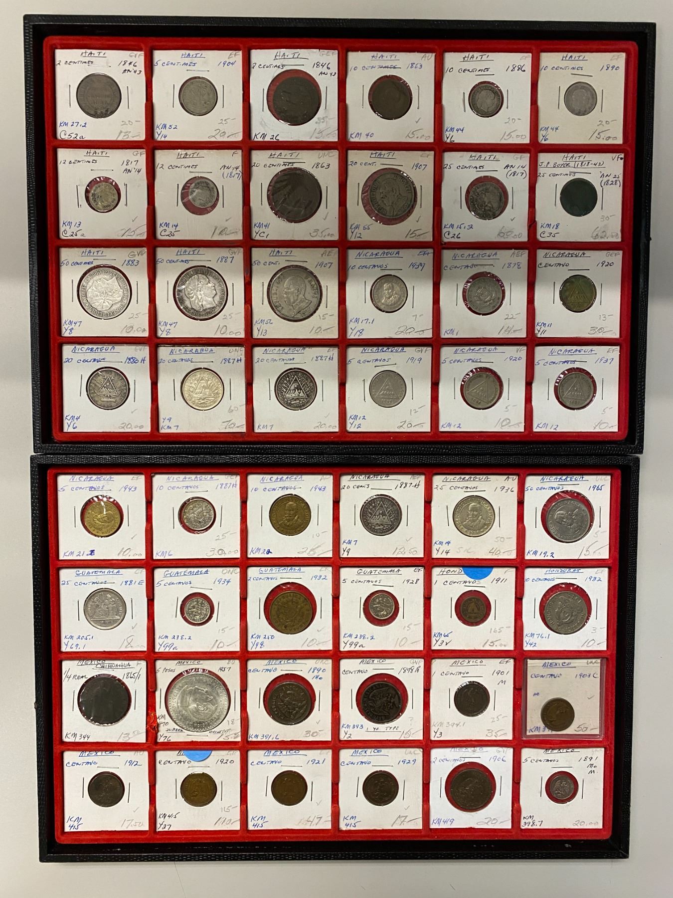 CENTRAL AMERICA: LOT of 62 coins, including 2 coins of Honduras; 4 of Guatemala (3 silver); 15 of Nicaragua, from 1878 onward, 6 silver, with several desireable high grade items; 15 of Haiti, from 1817 to 1907, 7 in silver; and 26 of Mexico, from 1865 to 1955, 6 silver, including a high grade 1865/1 Chihuahua 1/4 real (KM 344) and an UNC 1957 Constitution 5 pesos in UNC; retail value $750, lot of 62 pieces.