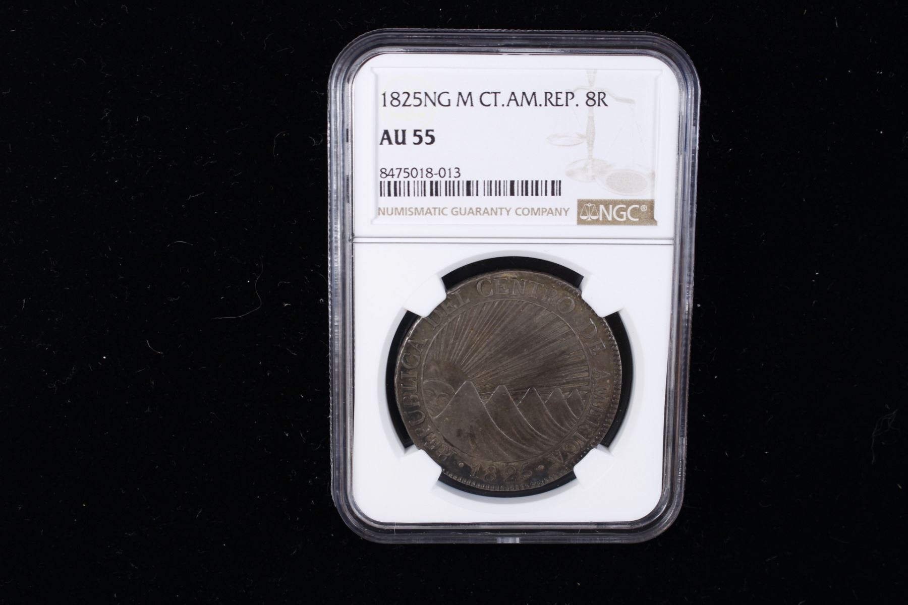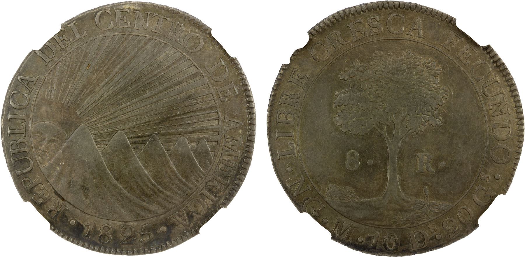 CENTRAL AMERICAN REPUBLIC: AR 8 reales, 1825-NG, KM-4, assayer M, radiant sun with face behind row of five volcanoes, an attractive toned example, NGC graded AU55.