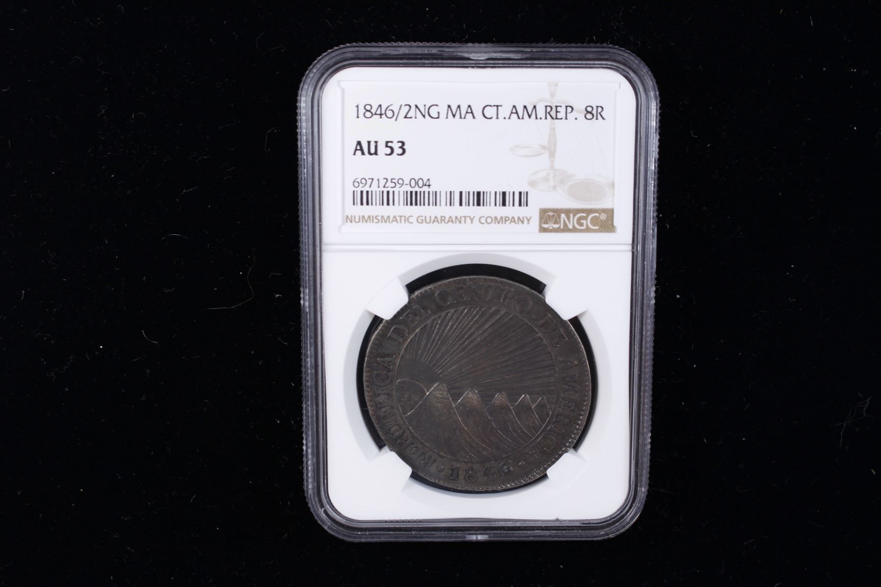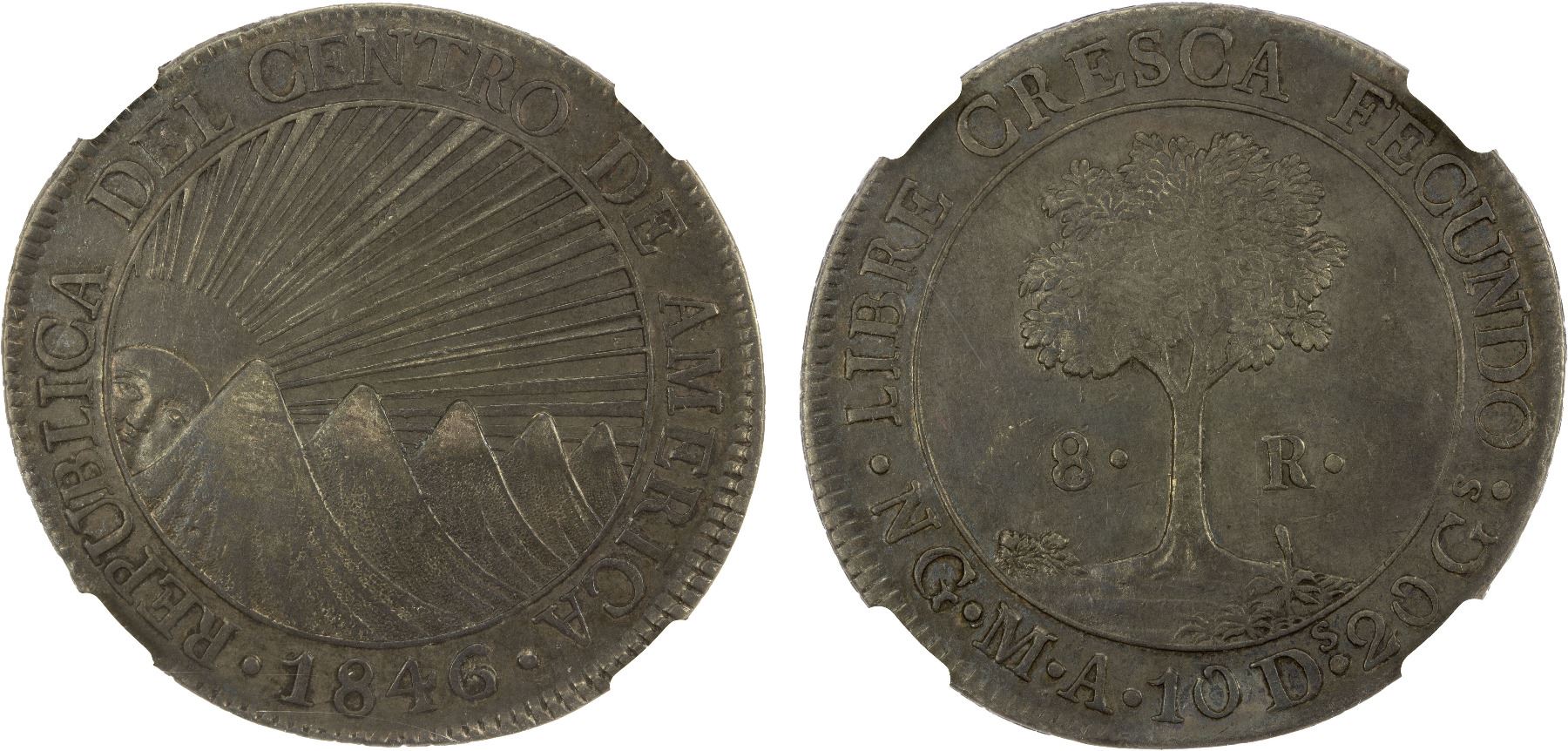 CENTRAL AMERICAN REPUBLIC: AR 8 reales, 1846/2-NG, KM-4, assayer MA, radiant sun with face behind row of five volcanoes, NGC graded AU53.
