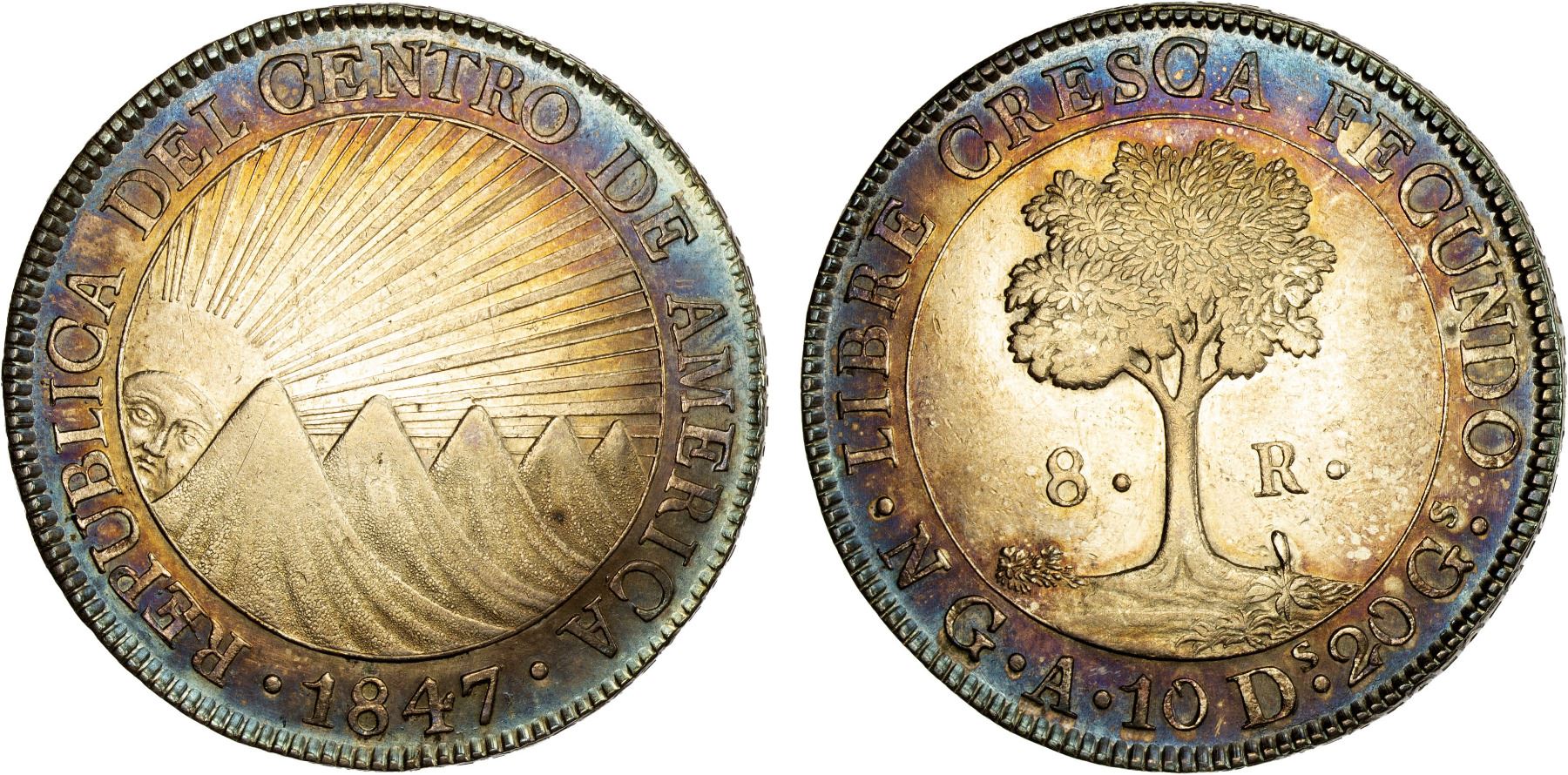 CENTRAL AMERICAN REPUBLIC: AR 8 reales, 1847-NG, KM-4, assayer A; lovely original toning, AU, ex Almer H. Orr III Collection.