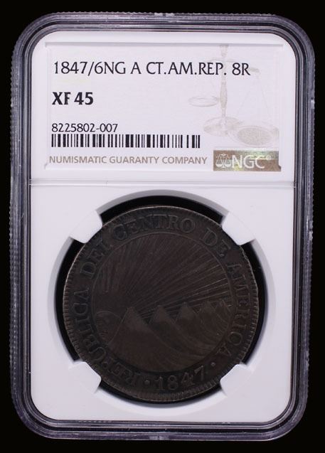 CENTRAL AMERICAN REPUBLIC: AR 8 reales, Guatemala, 1847/6-NG, KM-4, El-107, assayer A, deeply toned, overdate certain, NGC graded EF45.