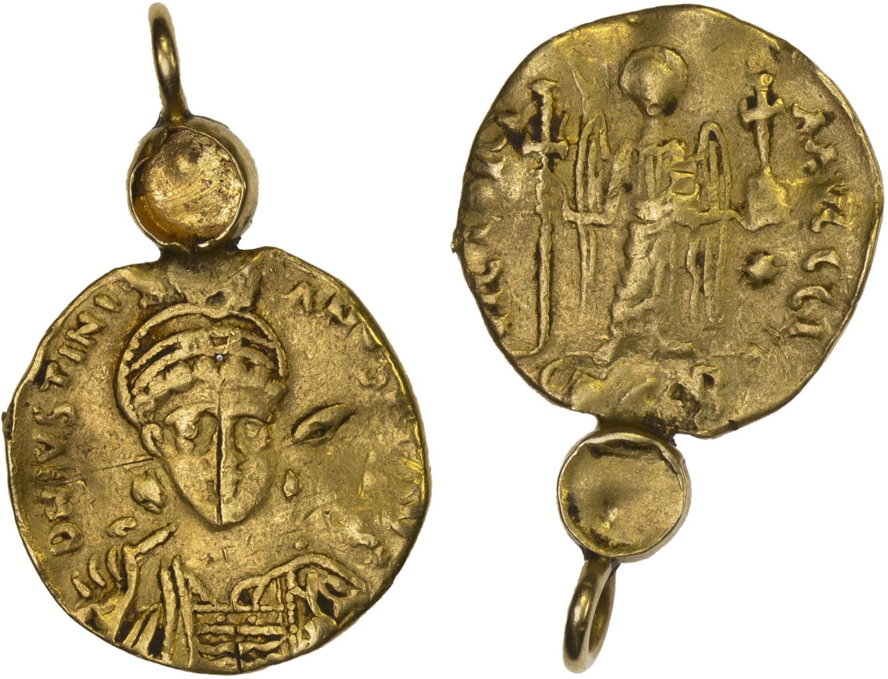 CENTRAL ASIA: Byzantine style, ca. 6th/7th century, AV burial piece (3.21g), A-3850, early bust of Justinian I (527-565) with his name still fully legible and holding spear behind his head // angel holding long cross and globus cruciger, with readable legend around, derived from his type Sear-137, with gold loop attached, together with a tiny gold bowl that probably originally contained a precious stone object, VF, RRR. Gold burial pieces come almost exclusively from Central Asia and adjacent areas south and east centered around the Silk Road. They are either bracteate or two-sided, and we now believe that they first appeared in about the 4th or 5th century with the design derived from Roman solidi, then became relatively common during the 6th-8th century based on Byzantine solidi, with the Byzantine style likely continuing to be copied into the 10th century or even later. Another group are based on Sogdian or Hunnic models and likely dated from the 7th to 9th or 10th century. We have also seen examples derived from Samanid, Seljuq, Khwarizmshah, Chaghatayid, and generic Arabic dinars, presumably from the 10th to at least the 14th century. These were normally used as burial pieces, places upon the deceased.