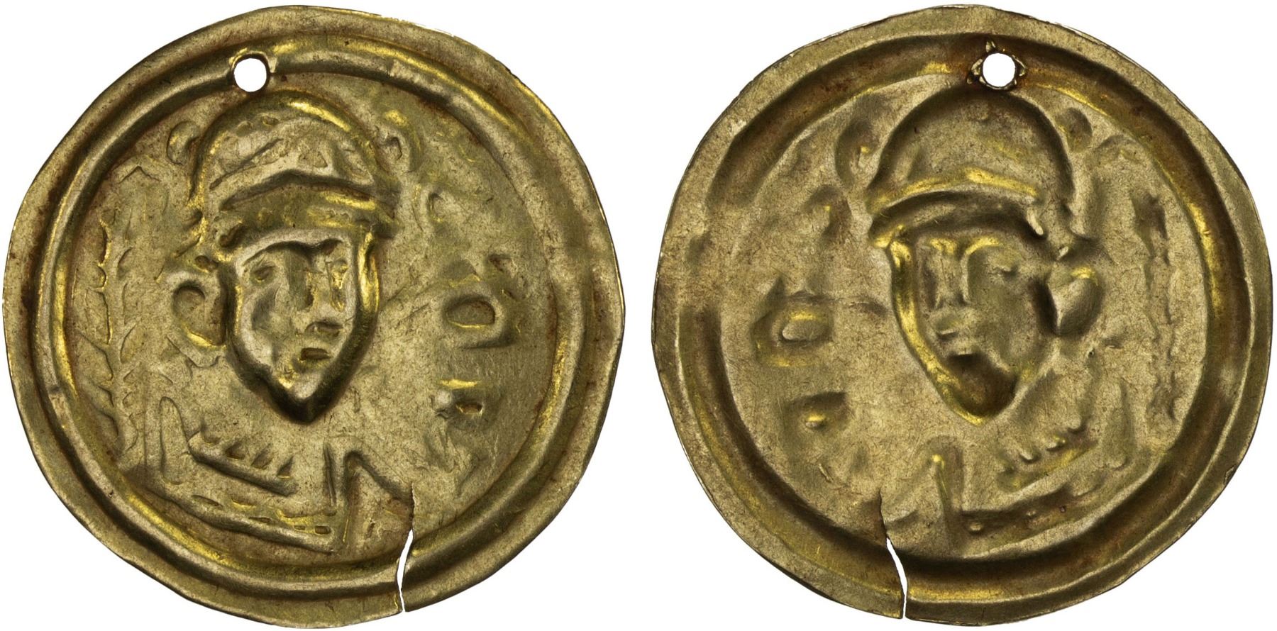 CENTRAL ASIA: Sogdian style, ca. 7th-9th century, AV bracteate burial piece (0.72g), A-3850, crowned bust turned slightly to the right, twig to left, meaningly pseudo-Sogdian name to right, possibly derived from one of the later Chach copper coins, pierced for suspension, VF, RRR. Gold burial pieces come almost exclusively from Central Asia and adjacent areas south and east centered around the Silk Road. They are either bracteate or two-sided, and we now believe that they first appeared in about the 4th or 5th century with the design derived from Roman solidi, then became relatively common during the 6th-8th century based on Byzantine solidi, with the Byzantine style likely continuing to be copied into the 10th century or even later. Another group are based on Sogdian or Hunnic models and likely dated from the 7th to 9th or 10th century. We have also seen examples derived from Samanid, Seljuq, Khwarizmshah, Chaghatayid, and generic Arabic dinars, presumably from the 10th to at least the 14th century. These were normally used as burial pieces, places upon the deceased.