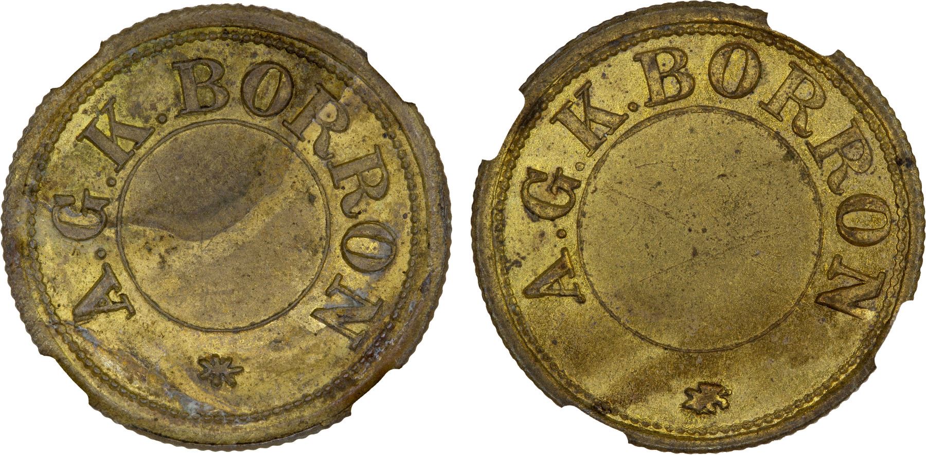 CEYLON: A.G.K. Borron, brass token, Prid-11, NGC graded MS61, RR.