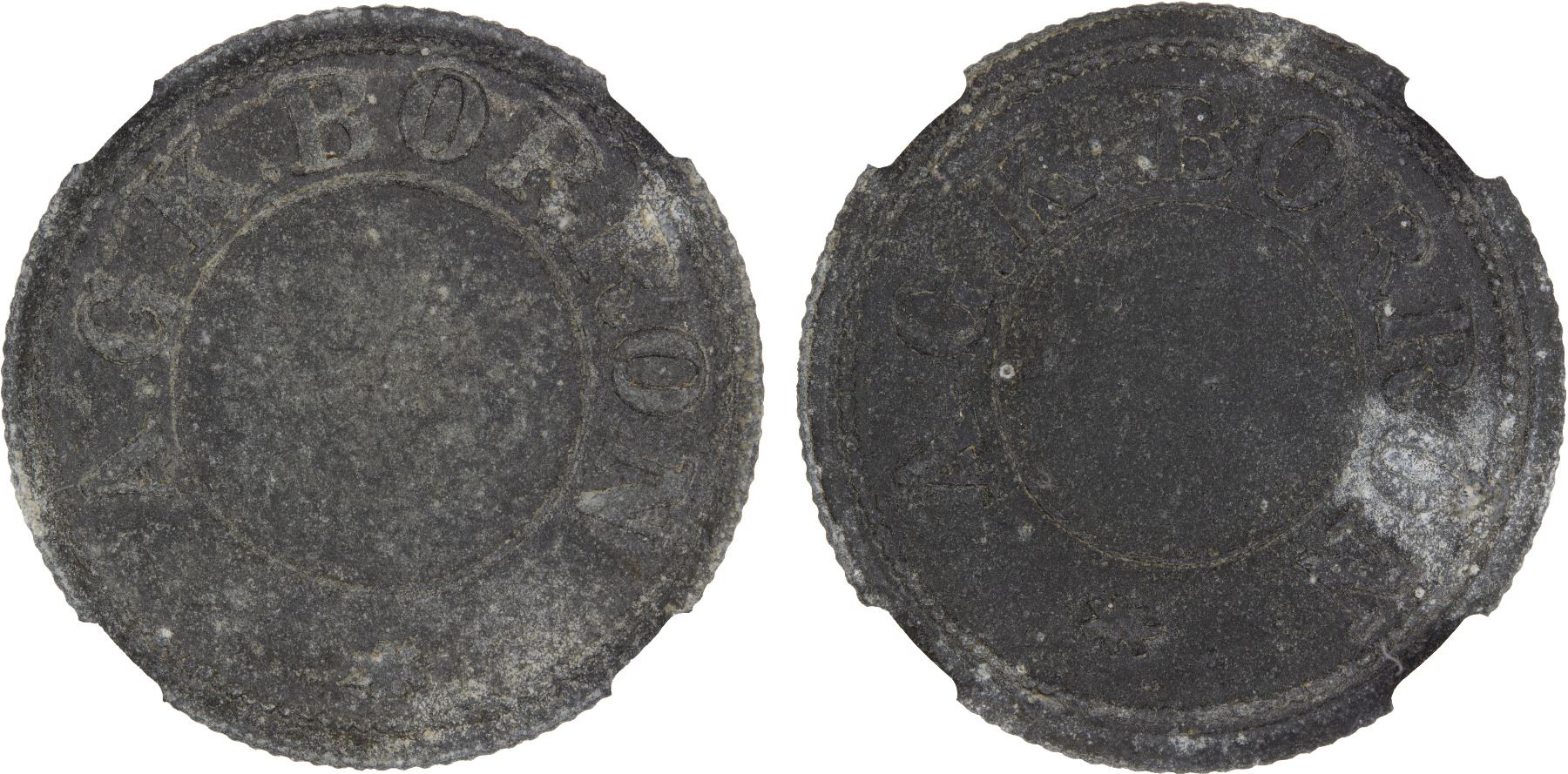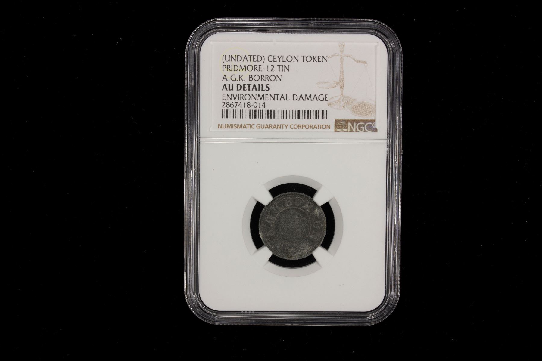 CEYLON: A.G.K. Borron, tin token, Prid-12, environmental damage, NGC graded AU details, RR.