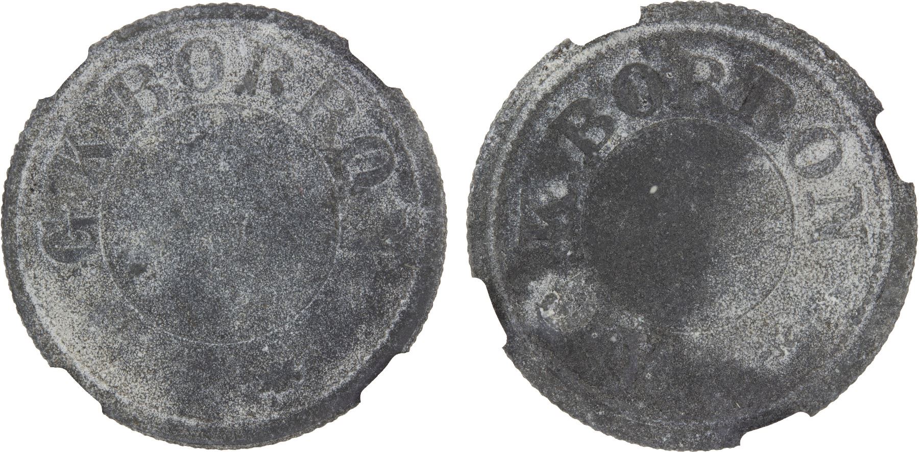 CEYLON: A.G.K. Borron, tin token, Prid-12, environmental damage, NGC graded AU details, RR.