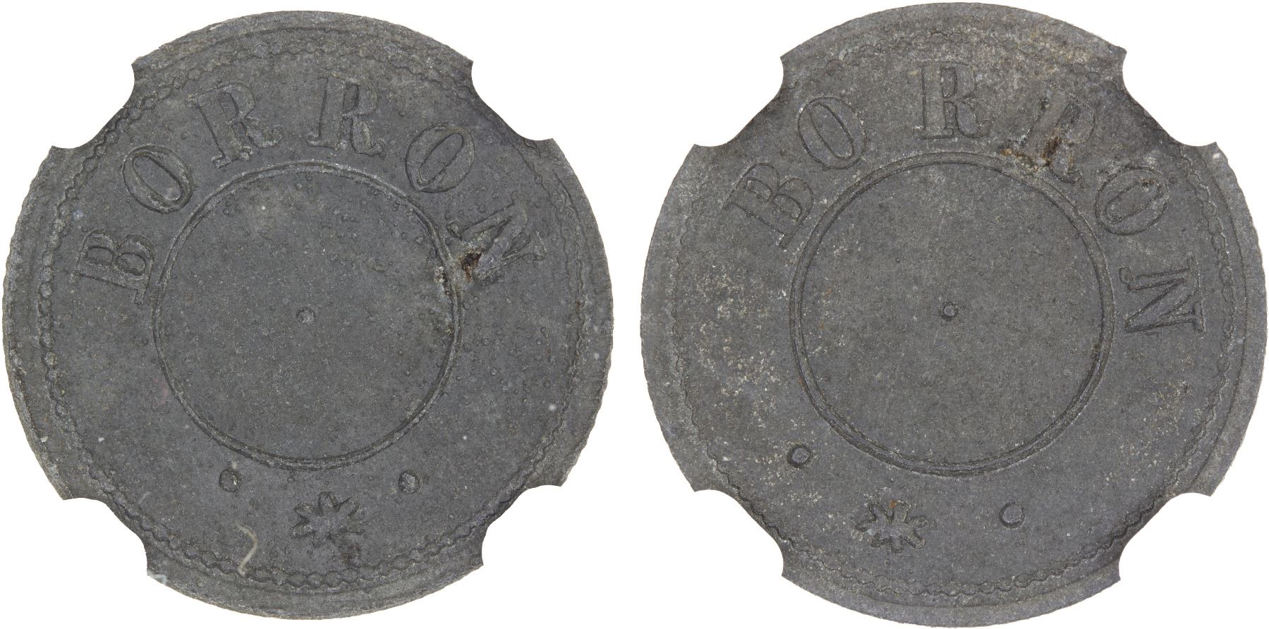 CEYLON: A.G.K. Borron, tin token, half size, Prid-13, environmental damage, NGC graded AU details, RR.