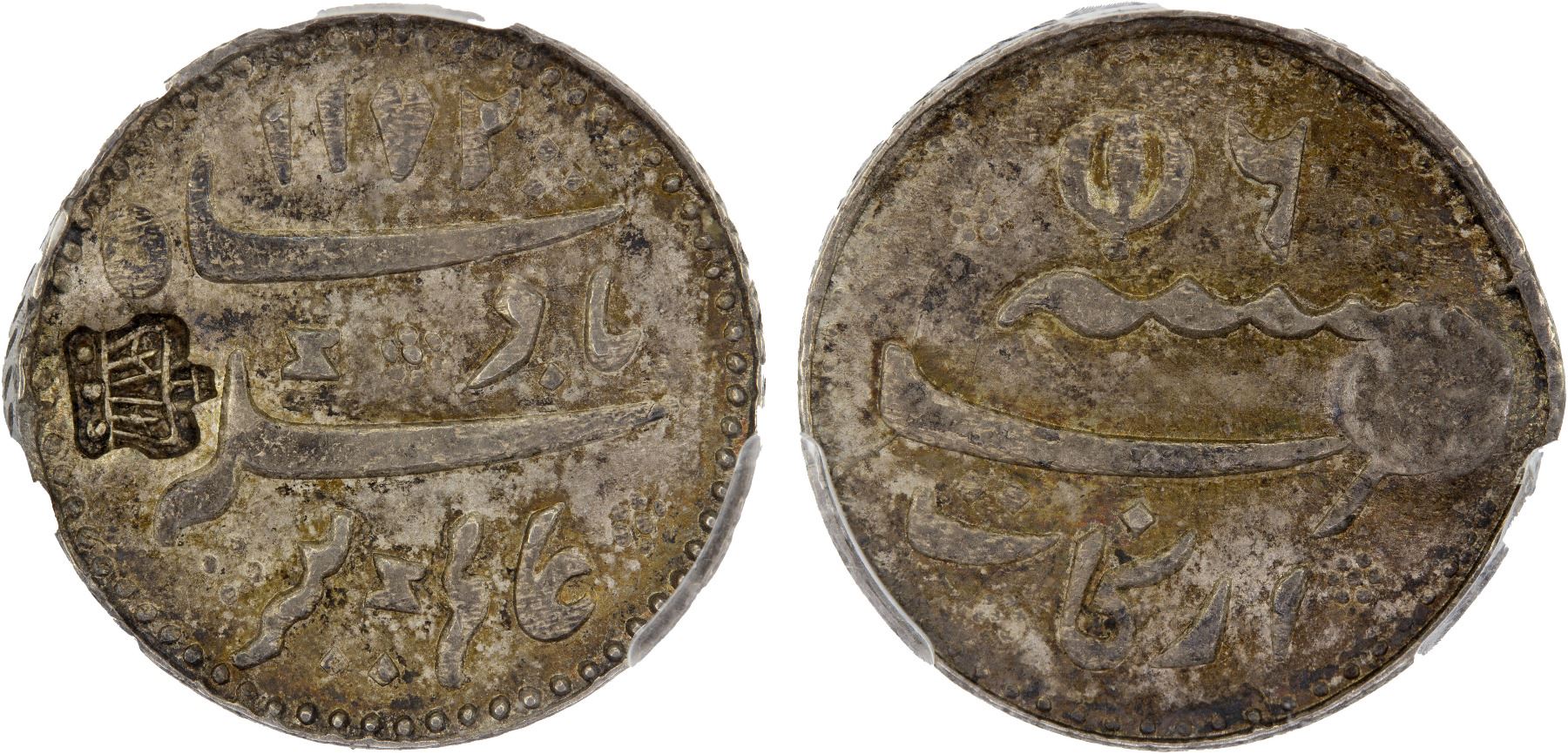 CEYLON: British Colony, AR 1/3 rixdollar, ND (1823), KM-85, Prid-25, crown countermark on obverse of AH1172 year 6 Madras Presidency 1/4 rupee, bold countermark, PCGS graded MS63. Finest graded at PCGS.The persistent coin shortage led to a special import of East India Company's Madras "Arcot" quarter rupees. To retain these coins in local circulation, they were countermarked with a crown. They were declared current by local proclamations dated March 22, 1823 to pass at 1/3 rixdollar or 4 fanams.