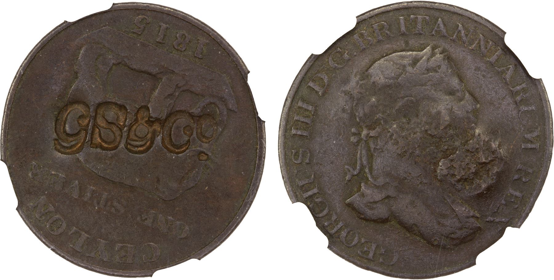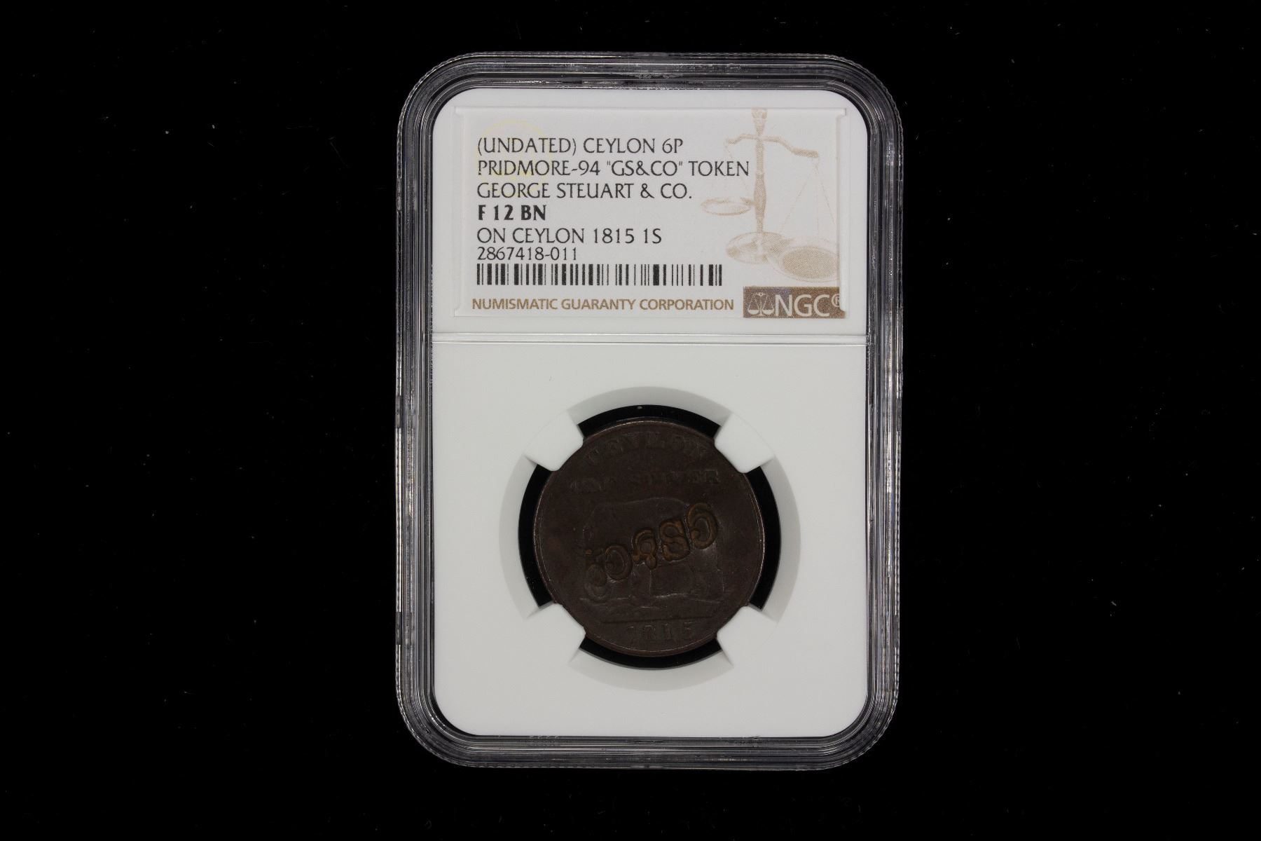 CEYLON: CS & Co (George Steuart & Co.), 6 pence, Prid-94, countermarked CS & Co on reverse of Ceylon stiver type KM-81 dated 1815; EF on Fine host, NGC graded F12 BN, RR, ex Mark E. Freehill Collection.