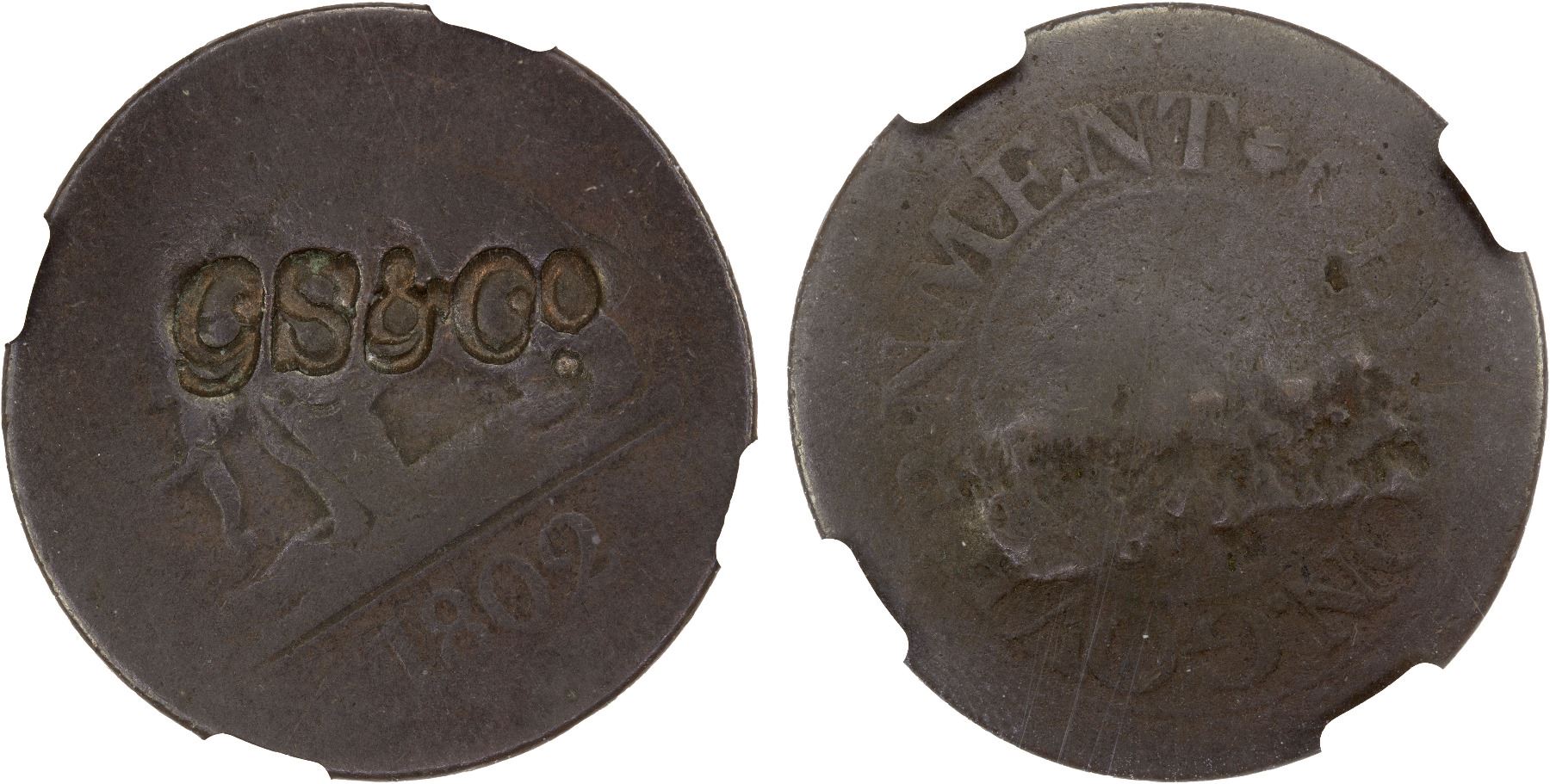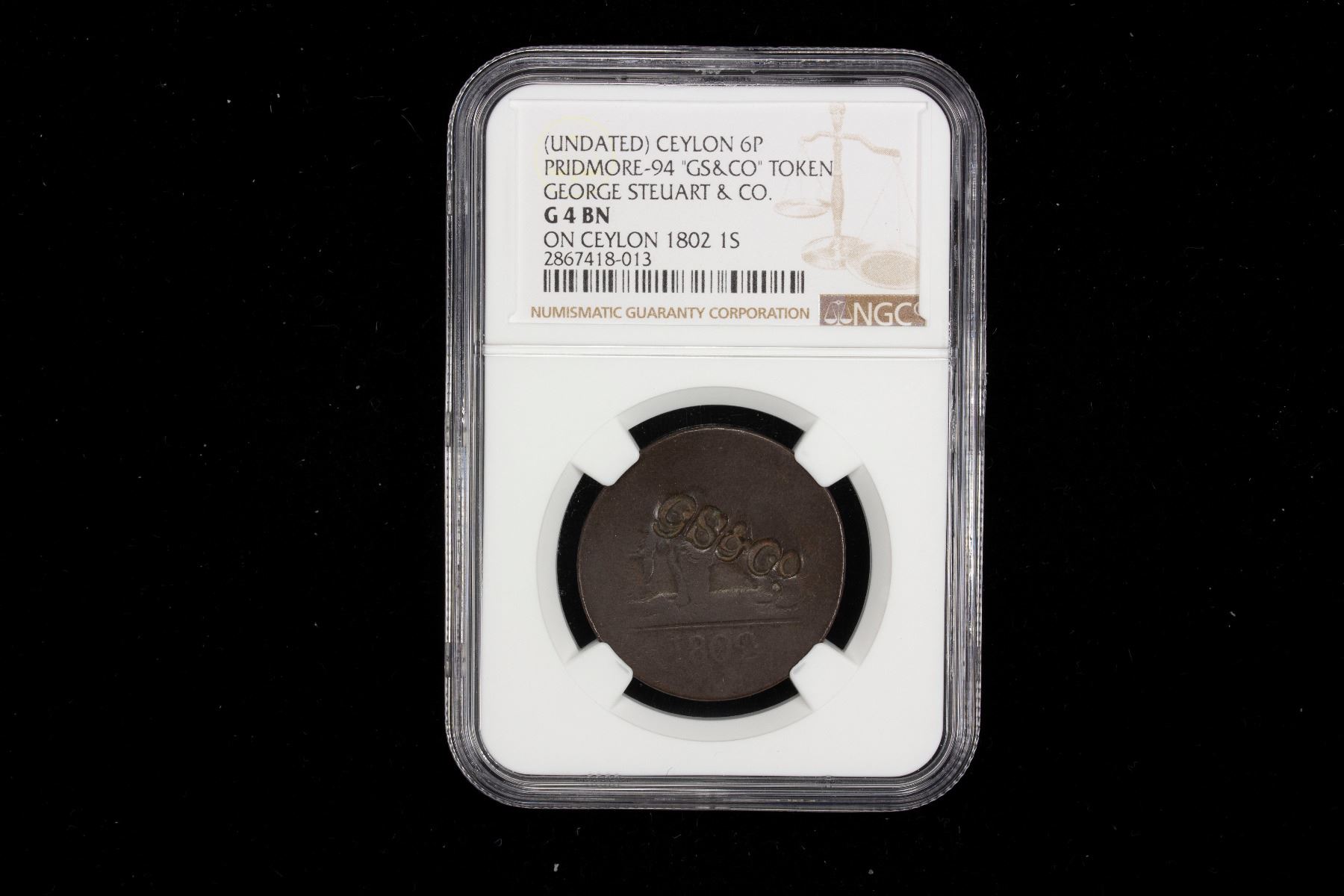 CEYLON: CS & Co (George Steuart & Co.), 6 pence, Prid-94, countermarked CS & Co on reverse of Ceylon 1/48 rixdollar type KM-75 dated 1802; EF on worn host, NGC graded G4 BN, RR, ex Mark E. Freehill Collection.