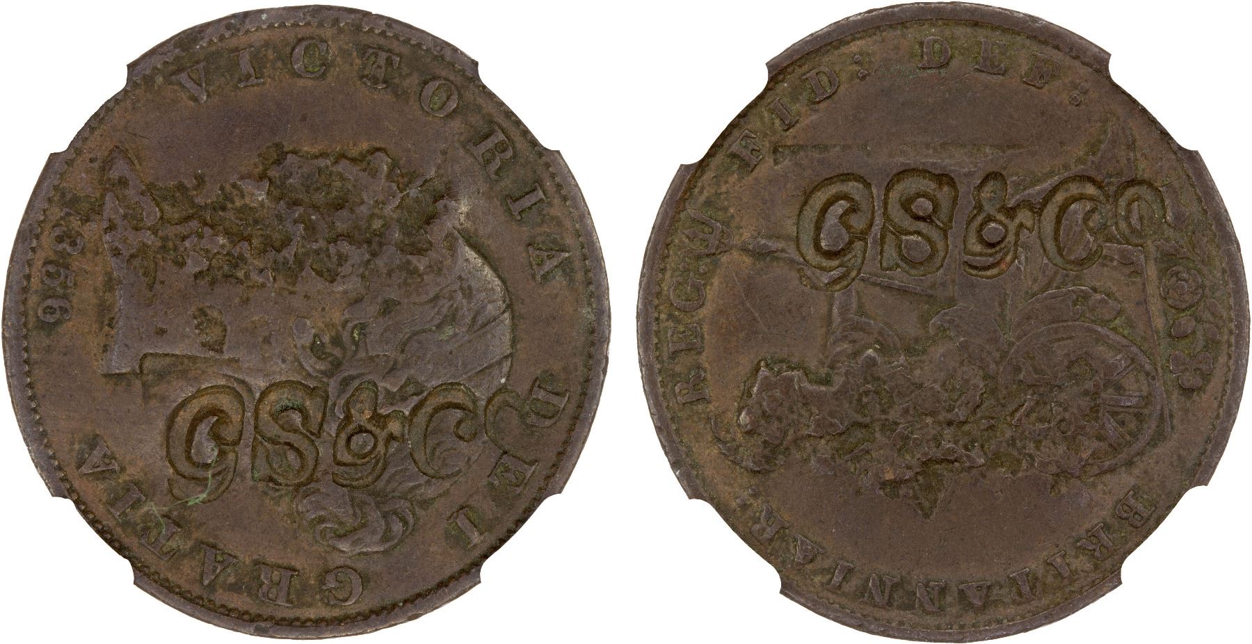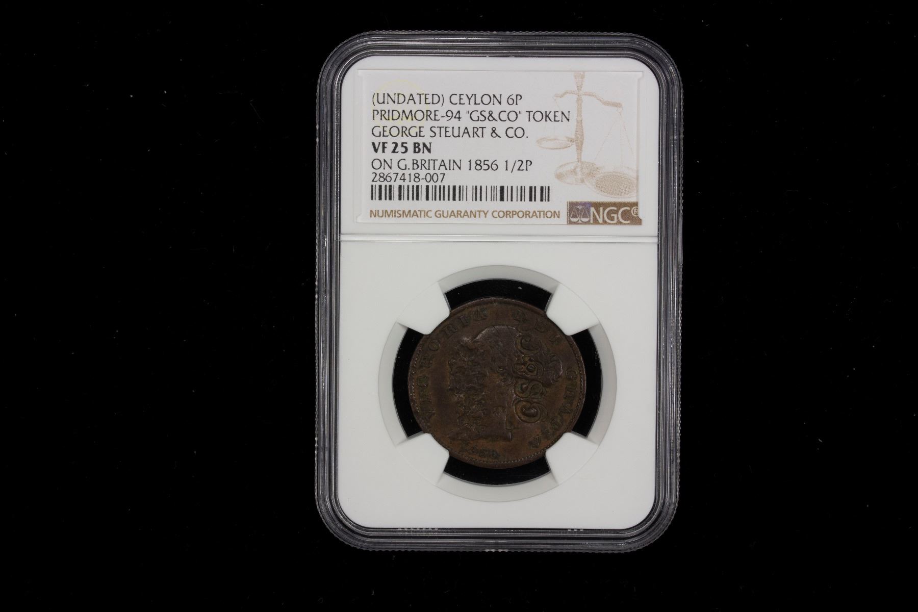 CEYLON: CS & Co (George Steuart & Co.), 6 pence, Prid-94, countermarked CS & Co once on both obverse and reverse of British 1/2 penny 1856; EF on VF host, NGC graded VF25 BN, RR, ex Mark E. Freehill Collection.