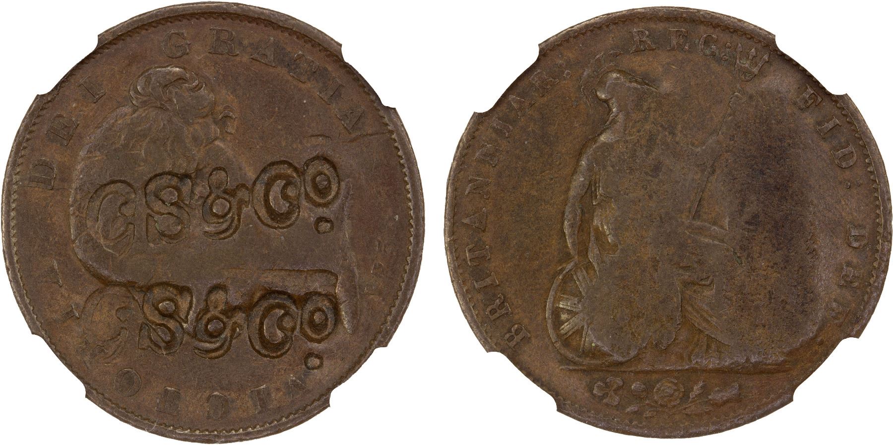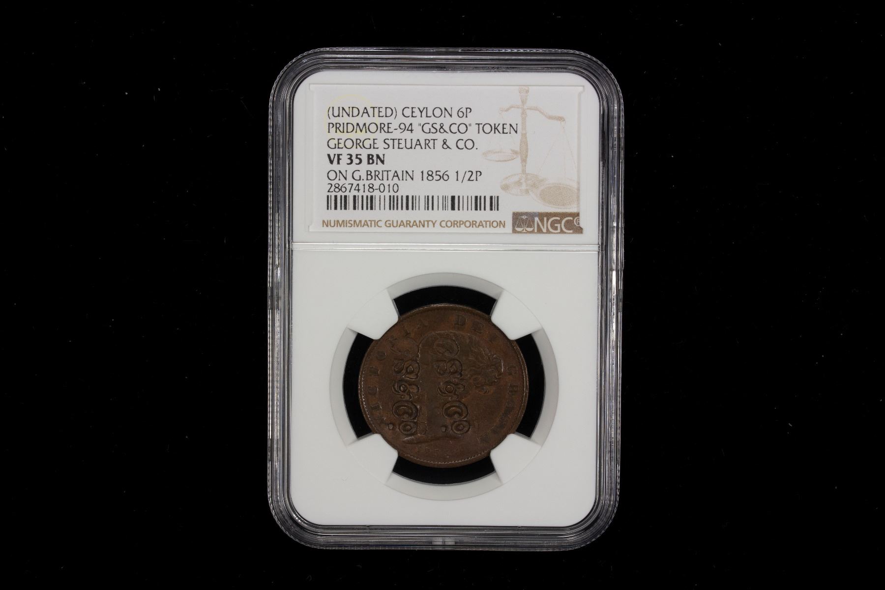 CEYLON: CS & Co (George Steuart & Co.), 6 pence, Prid-94, countermarked CS & Co twice on the obverse of British 1/2 penny 1855; EF on VF host, NGC graded VF35 BN, RR, ex Mark E. Freehill Collection. Incorrectly called 1856 on the slab.