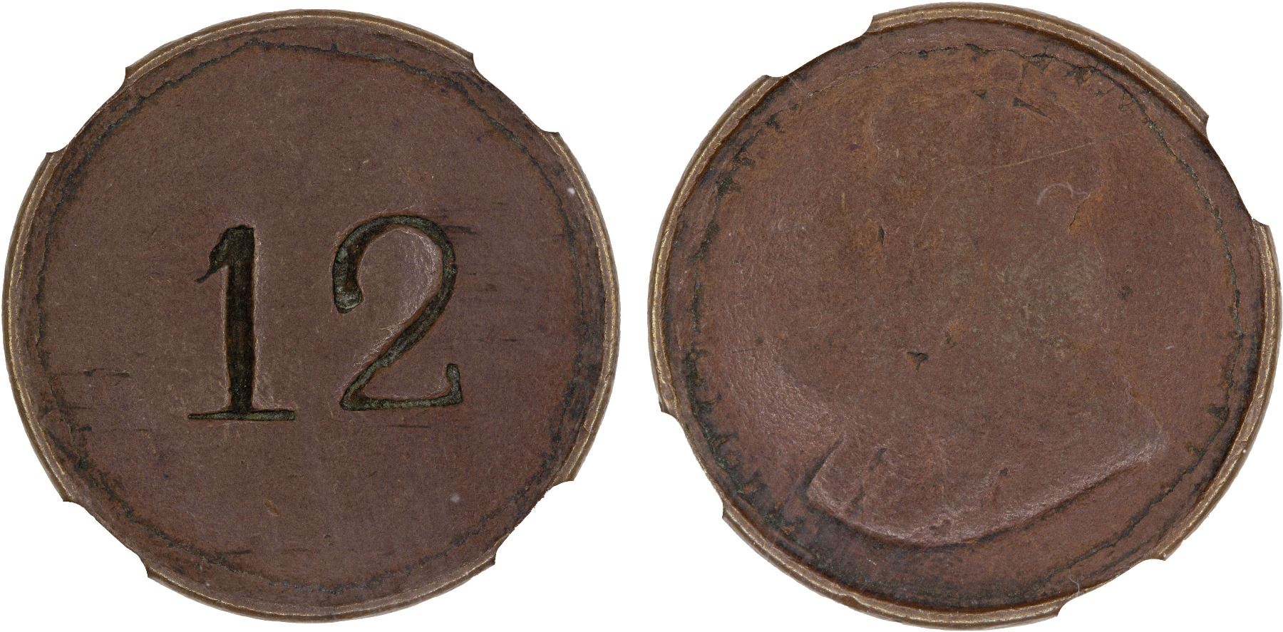 CEYLON: Countermarked Tokens, AE 12 cent token, Prid-116, countermarked "12" on smoothed reverse (for 12 cents) of British Ceylon cent of George V, marked "Genuine" by NGC (no grade), RR.