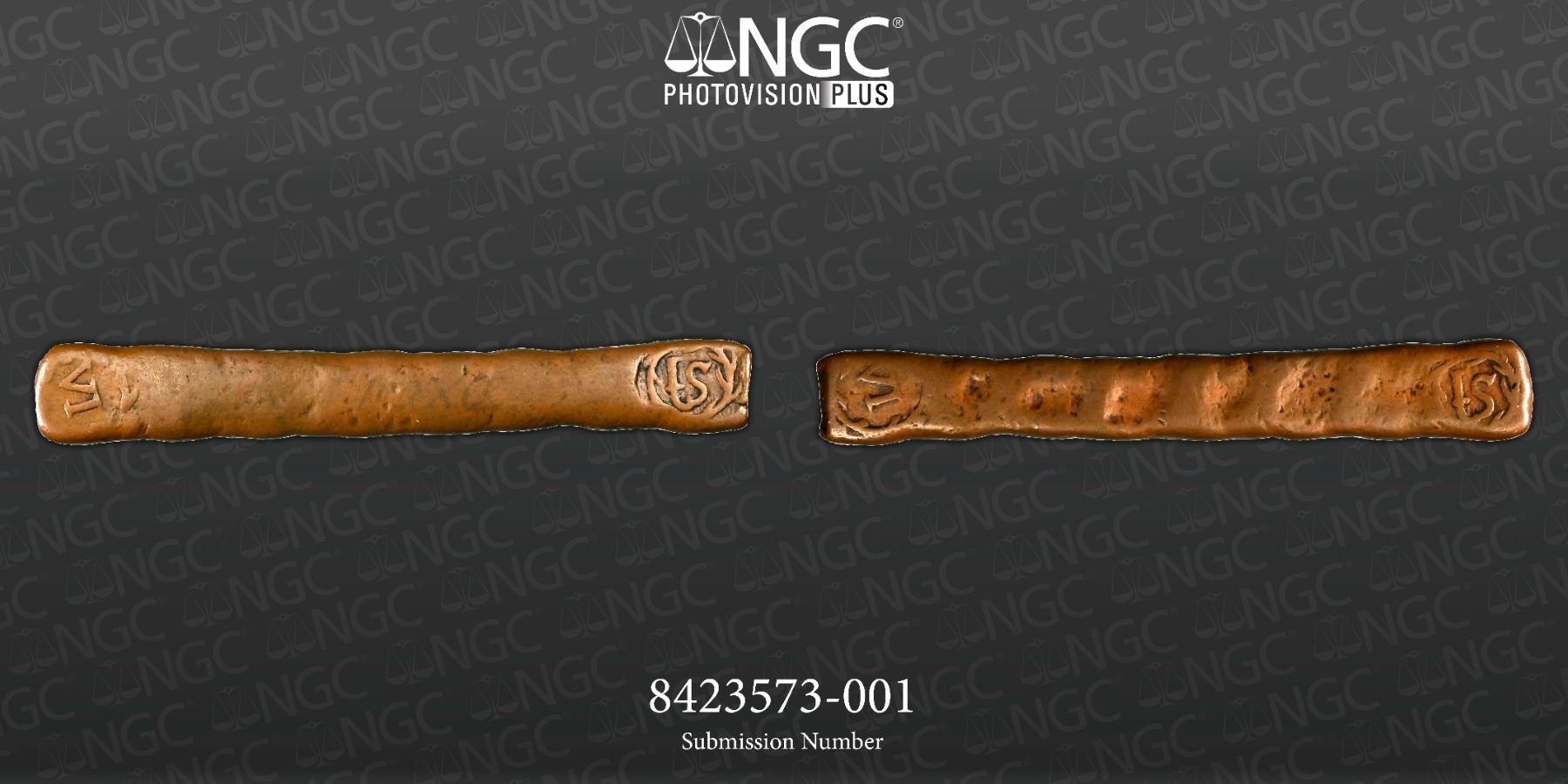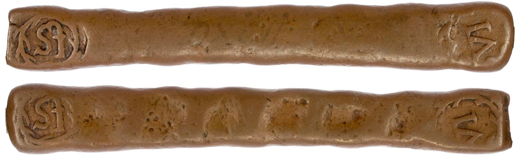 CEYLON: Dutch, AE 6 stuiver (1/2 larin) (65.74g), Colombo, ND (1660-1720), KM-21, Scholten-1288a, Passon-53.4, dump style bar, St within leafy wreath at left end of bar and VI in similar wreath at right end of bar, repeated on the reverse, letters DXCII (Roman for 592) written in museum ink on one side, noted as circa 1660-1720 on the NGC label, described as circa 1712 on the Lakdiva website, an item of the utmost rarity that almost never comes up for auction, NGC graded VF30 BN, RRR, ex Taisei-Baldwin-Gillio Auction 19, February 23, 1995, Lot 48; ex Dick Ford Collection. The 6 stuiver issues were struck from Japanese copper bars as emergency coins to compensate for the silver larins which were being hoarded by the local people and caused a temporary silver shortage. The rate of the silver larin at that time was 12 stuivers, thus the bronze 6 stuivers had a value of 1/2 of a silver larin. The copper bars were struck on each end with the value VI / St within a leafy wreath. Neither length (which varies from approximately 98 to 127 mm) nor the weight is constant across all issues.